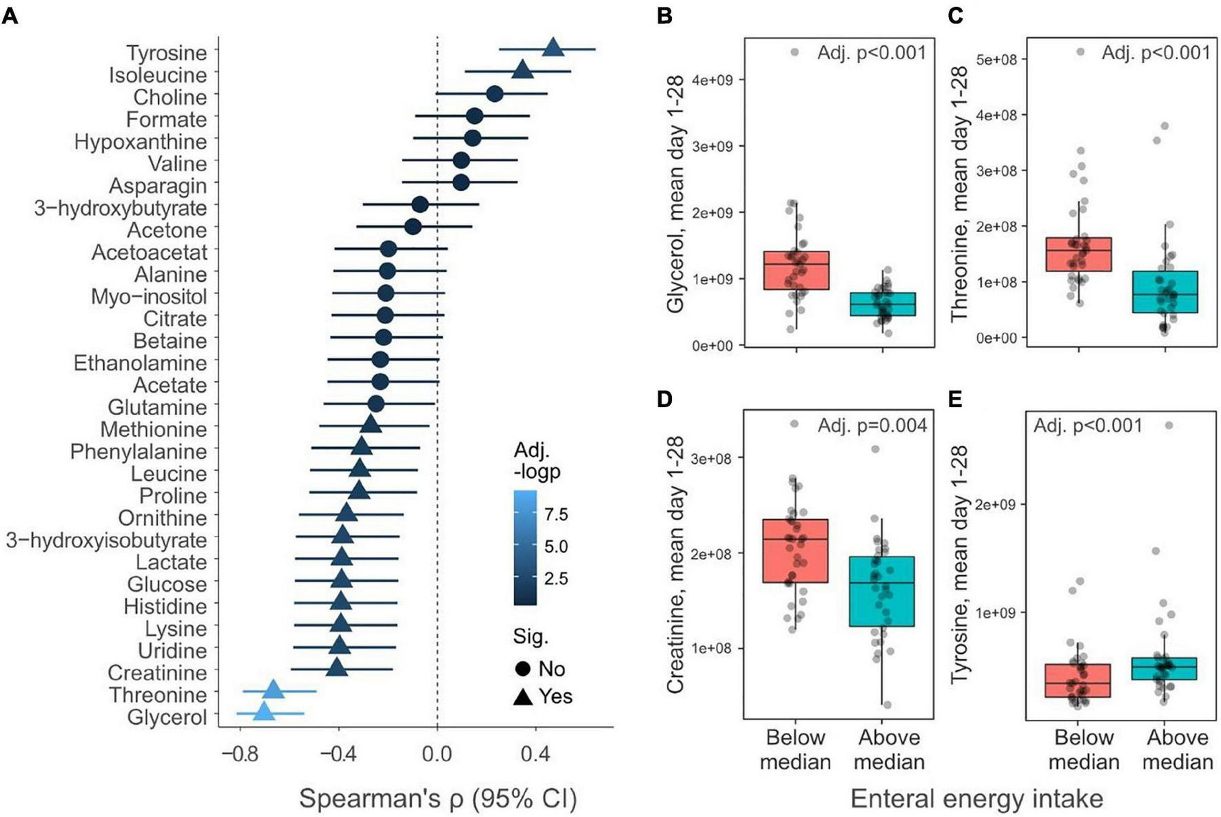 Relationship between enteral nutrition and serum metabolites. (A) Spearman correlation (95% confidence interval) between energy provided as enteral nutrition day 1–28 and mean daily metabolite levels during the corresponding period (n = 69). Triangles indicate metabolites that significantly (p < 0.05) correlate with enteral energy intake and the color of the symbols reflect the negative logarithm of the p-value. (B–E) Boxplots show mean daily levels of selected metabolites that depend on the total energy provided as enteral energy. Infants have been dichotomously grouped if they received above (n = 34) or below (n = 35) the median amount of total energy as enteral energy day 1–28. Y-axis shows normalized NMR signal. p-values have been false discovery rate adjusted using the Benjamini–Hochberg method.