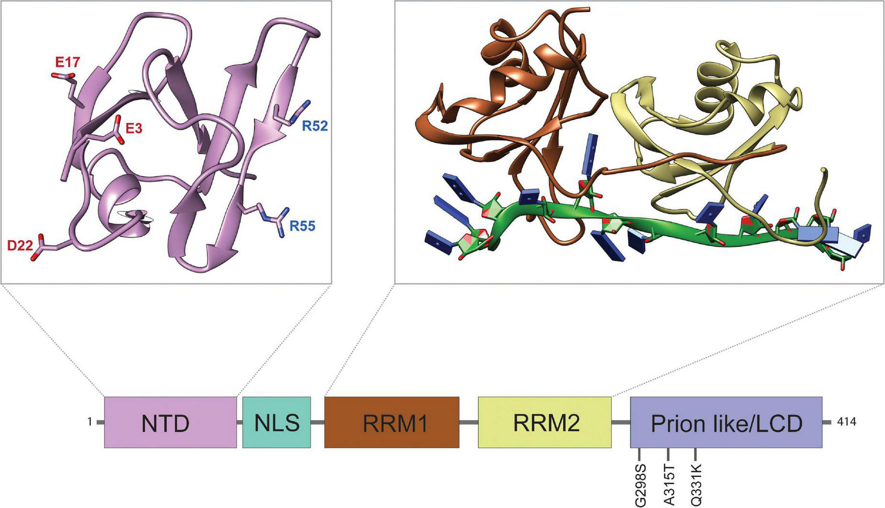 Structure and Domain Features of TDP-43. Domain map of TDP-43 depicting the approximate sizes of functional domains. The disease-associated mutations discussed in this review are highlighted. From left to right: N-terminal domain (NTD), nuclear localization signal (NLS), RNA-recognition motif 1 (RRM1), RNA-recognition motif 2 (RRM2), and low complexity domain (LCD). Top left panel: structure of the NTD (PDB ID: 5MDI) with aggregation antagonizing amino acid residues E3, E17, D22, R52, and R55, as indicated (Afroz et al., 2017). The negatively charged NTD residues (red) form salt bridges with positively charged residues (blue) of other TDP-43 NTDs to form oligomers. Top right panel: structure of the tandem RRMs bound to UG-rich RNA (PDB ID: 4BS2) (Lukavsky et al., 2013). The RNA-structure is shown in green with nucleobases represented by blue rectangles.