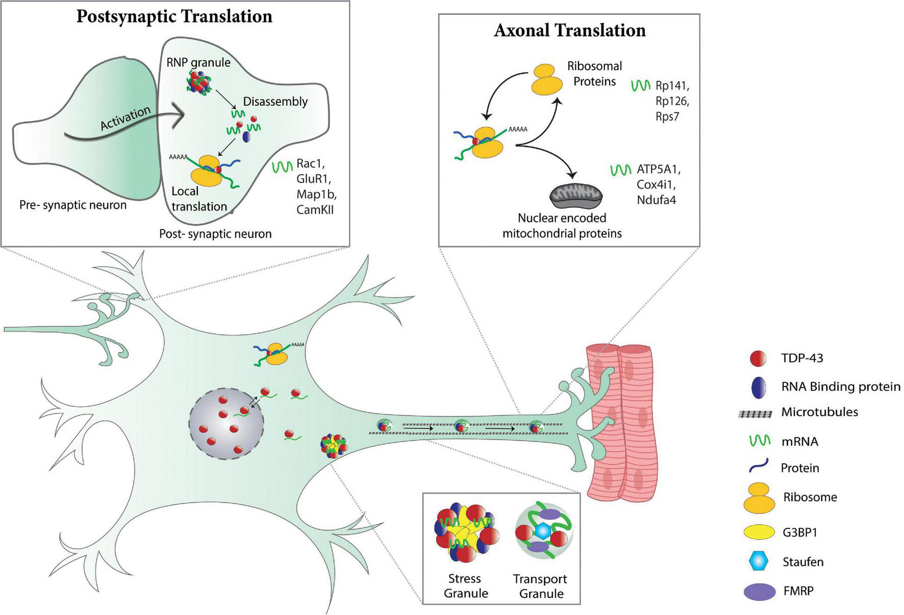 Physiological control of local translation by TDP-43. Post-synaptic translation (top left panel): in dendrites, activation of the post-synaptic neuron triggers the dissolution of dendritic RNP granules that in turn, causes the release of translationally silenced mRNAs making them available for translation. TDP-43 is a component of dendritic RNP granules and regulates dendritic translation of various mRNAs (Rac1, GluR1, Map1b, CamKII) (Wong et al., 2021). Stress and transport granules (bottom panel): TDP-43 associates with stress and RNA transport granules and is necessary for dendritic (Chu et al., 2019) and axonal transport (Alami et al., 2014) of mRNA-containing RNP granules. Axonal translation (top right panel): in axons, TDP-43 regulates local translation of mRNAs for ribosomal proteins (Rp141, Rp126, Rps7) and nuclear encoded mitochondrial proteins (ATP5A1, Cox4i1, Ndufa4) (Nagano et al., 2020; Altman et al., 2021).