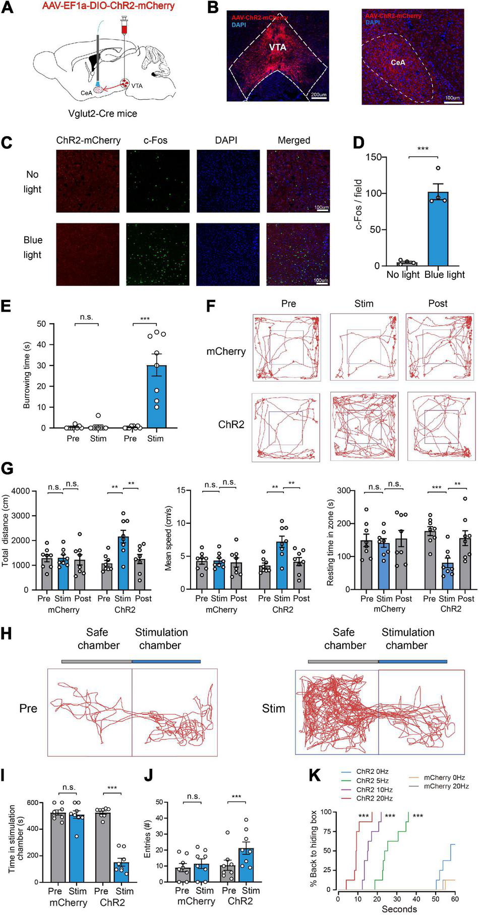 Photoactivation of glutamatergic VTA-CeA pathway promotes defensive behaviors. (A) Schematic of AAV-EF1a-DIO-ChR2-mCherry expression in the VTA and fiber implantation in the CeA for photostimulation. (B) Fluorescent images showing glutamatergic ChR2-mCherry SOMA in the VTA (left) and terminals projecting to the CeA (right). Scale bar represents 200 and 100 μm. (C,D) c-Fos expression in the CeA without (top) or with (bottom) light stimulation. (n = 4, 8 sections for each group. two-tailed unpaired t-test; t6 = 8.817, P < 0.001). Scale bars represent 100 μm. (E) Burrowing duration upon stimulation of the glutamatergic VTA-CeA pathway in the home cage [n = 8 ChR2 vs. n = 8 mCherry; two-way repeated-measures ANOVA, virus × stimulation, F(1,14) = 31.26, P < 0.001, Bonferroni post hoc comparison]. (F) Examples of tracking traces of mice in open field tests. (G) Photostimulation of the glutamatergic VTA-CeA pathway influenced total distance, mean speed and resting time in open field experiments [n = 8 ChR2 vs. n = 8 mCherry; two-way repeated-measures ANOVA, virus × stimulation, F(2,28) = 6.727, P = 0.0041, F(2,28) = 6.716, P = 0.0041, F(2,28) = 4.442, P = 0.0211, Bonferroni post hoc comparison]. (H) Example trajectories of mice in RTPP tests. (I,J) Photostimulation of glutamatergic VTA-CeA pathway influenced the stimulation chamber staying time and safe chamber entries of mice in the RTPP experiment. [n = 8 ChR2 vs. n = 8 mCherry; two-way repeated-measures ANOVA, virus × stimulation, F(1,14) = 82.24, P < 0.001, F(1,14) = 5.211, P < 0.05, Bonferroni post hoc comparison]. (K) Real-time probability of hiding upon stimulating the glutamatergic VTA-CeA pathway (n = 8 ChR2, n = 8 mCherry; Kaplan–Meier survival analysis with Bonferroni’s multiple comparison; Log rank = 99.124, P < 0.001, mCherry: 20 Hz-sham, P = 0.96; ChR2: 5 Hz-sham, P < 0.001; 10 Hz-sham, P < 0.001; 20 Hz-sham, P < 0.001). Data are expressed as mean ± SEM. **P < 0.01, ***P < 0.001, n.s., not significant.