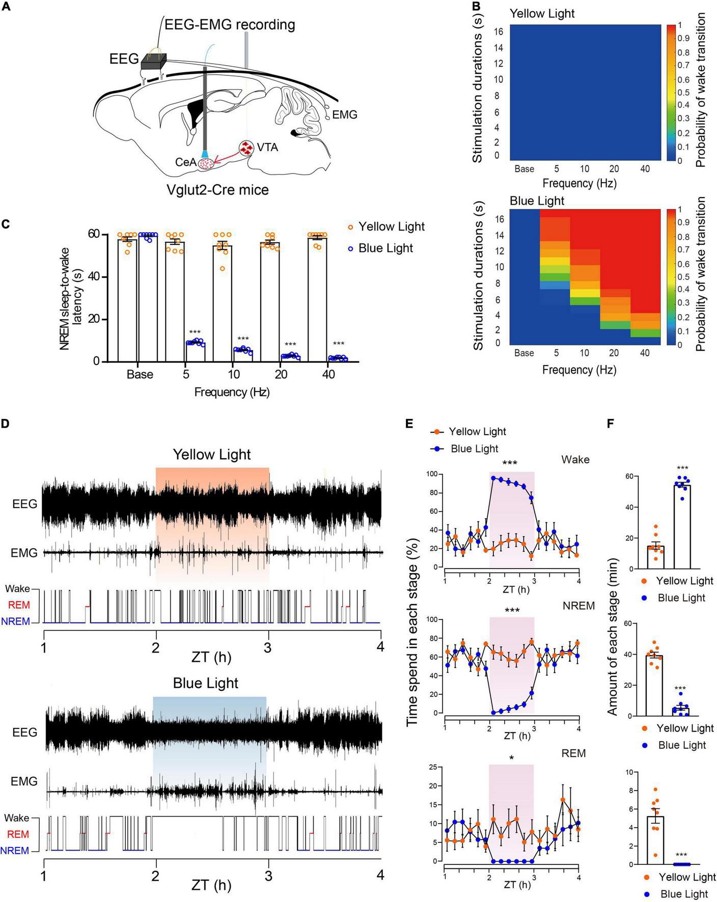For polysomnographic recording, mice were implanted with both electroencephalogram (EEG) and electromyogram (EMG) electrodes. Two stainless steel screws were inserted through the skull of the cortex and served as EEG electrodes, and two stainless-steel Teflon-coated wires were bilaterally placed in bilateral trapezius muscles and served as EMG electrodes, as described previously (Cai et al., 2020, 2022). One week before starting the recording, the mice were transferred to a transparent cylinder and housed individually. At least 3 days before the recording, the EEG/EMG electrodes were connected to a cable line. A slip-ring was used to connect the recording cable and ensure that mice could move freely. EEG/EMG signals were amplified, filtered and recorded using the Vital Recorder Software (Kissei Comtec, Japan). In acute optogenetic stimulation experiments, a light source emitted from a laser diode (Newdoon, China) was transmitted via a rotating optical joint (FRJ_FC-FC, Doric Lenses, Canada) for optogenetic stimulation. Blue light (473 nm) and yellow light (589 nm) were applied from 5 to 40 Hz for 16 s to examine the NREM-WAKE transition probability, and 60 s of continuous stimulation was applied to test their NREM-WAKE transition latency. For the chronic light stimulation experiment of the VTA glutamatergic neurons, we administered light stimulation at Zeitgeber Time 02:00–05:00, while we applied light stimulation on the glutamatergic VTA-CeA pathway at Zeitgeber Time 02:00–03:00. Sleep–wake states were automatically classified into wake, NREM and REM sleep according to the SleepSign software criteria. After analyzed by software, all epochs were further checked and corrected artificially. All of the experiments were conducted during the inactive period of mice (lights on period, Zeitgeber Time 00:00–12:00).