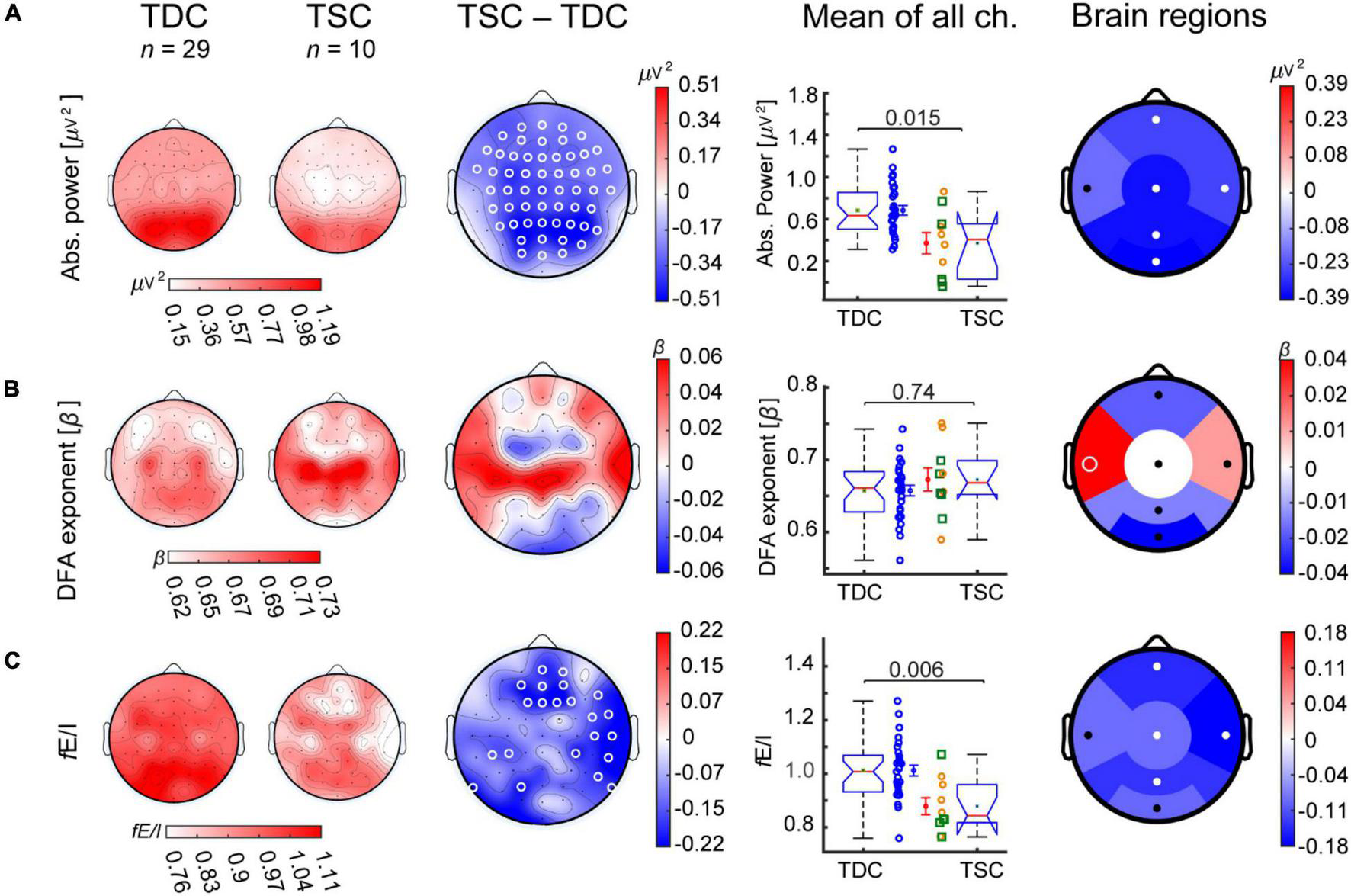 Participants with TSC show lower alpha-band absolute power and fE/I than TDC. Grand-average topographies are shown for TDC (first column), TSC (D0; second column), and for TSC-minus-TDC (third column) for the alpha-band biomarkers (A) absolute power, (B) DFA, and (C)fE/I. (A) The TSC group (D0, baseline) showed lower absolute power compared to TDC in most electrode locations and regions. (B) The DFA exponent was not different between groups. (C)fE/I ratios were also lower in TSC compared to TDC, particularly in frontal and temporal right regions. Comparisons in boxplots (fourth column) were based on the average value of the EEG biomarkers across all 64 channels (Wilcoxon rank-sum test). Individual-subject values, mean, and SEM are shown for TDC (blue circles) and TSC [concomitant treatment with antiepileptic drug (yellow circles) or not (green squares)]. Comparisons between groups are also shown for regional averages of frontal, temporal left, temporal right, central, parietal, and occipital electrodes (fifth column). White circles represent significant regions (p-value < 0.05, Wilcoxon rank-sum test, FDR corrected).