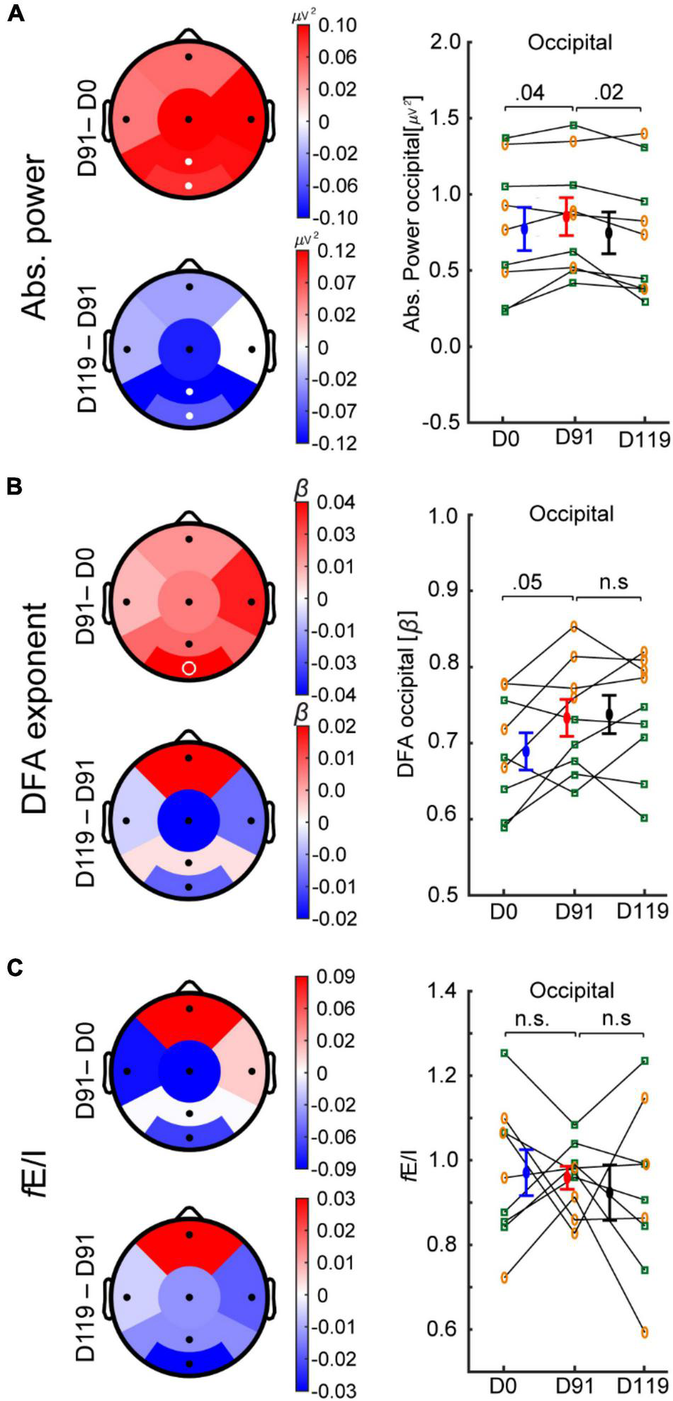 After 91 days of bumetanide treatment, only regional effects on the EEG were observed. Specifically, the absolute power increased in parietal and occipital regions (Figure 3A; Cohen’s d = 0.3 and 0.2, respectively). After the washout period (D119) absolute power decreased in the parietal region (Cohen’s d = 0.4) and the occipital region (Cohen’s d = 0.3). LRTC increased in the occipital region; however, this was not significant after multiple-comparison correction (Figure 3B, p = 0.05). We did not find a significant change in fE/I in any regions (Figure 3C).