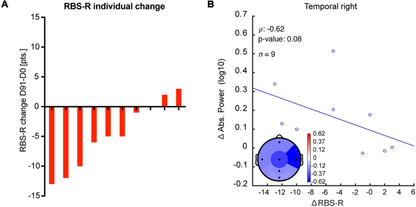 Change in absolute power after bumetanide shows a moderate, albeit non-significant, correlation with improvement in repetitive behavior. (A) Rank-ordered change in RBS-R in response to bumetanide for each participant (D91-minus-D0). (B) A moderate correlation, yet non-significant, was observed between an increment in absolute power and improvement in repetitive behavior after bumetanide (RBS-R), specifically in the right temporal region.