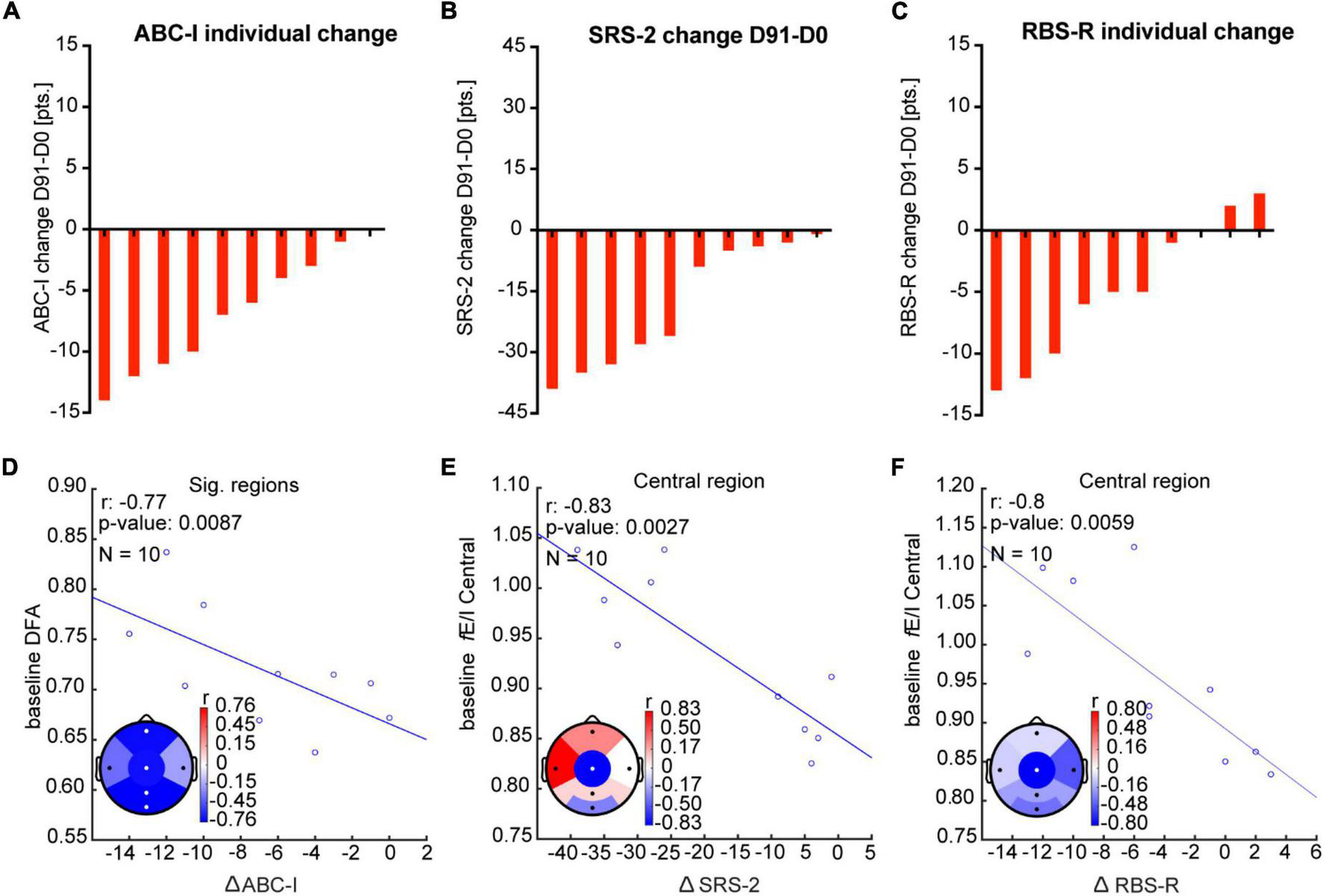Baseline EEG measures correlate with clinical outcomes after bumetanide. (A–C) Rank-ordered change in ABC-I, SRS-2, and RBS-R in response to bumetanide for each participant (D91-minus-D0). (D) Improvement in irritability score (ABC-I) was strongly related (rho = 0.8) to higher DFA at baseline, particularly in frontal, central, parietal, and occipital regions. (E,F). We found a strong correlation (rho = 0.8) between high fE/I at baseline in the central region and improvement in SRS-2 and RBS-R. Significant regions are represented with white dots (Pearson correlation coefficient, p < 0.05, FDR corrected q = 0.15).