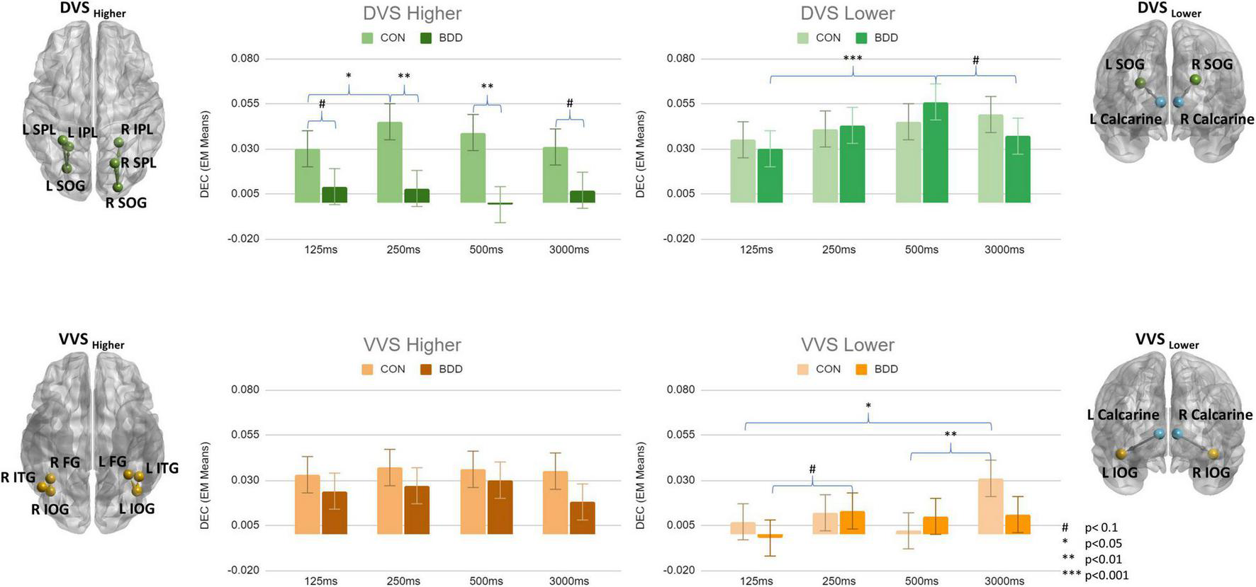 From tests of fixed effects, there was a significant three-way interaction between group, duration and connectivity category, F[9, 208601] = 2.31, p = 0.014. BDD individuals exhibited weaker DEC than controls in DVSHigher during all stimuli presentation durations (125ms: p = 0.085; 250 ms: p = 0.004; 500 ms: p = 0.003; 3000 ms: p = 0.064) (Figure 2). There were no significant between-group differences for the other connectivity categories (i.e., DVSLower, VVSLower, and VVSHigher). Within-group, from univariate tests, the simple duration effect was significant for VVSLower in controls, F[3, 208601] = 4.01, p = 0.007; they exhibited weaker DEC for VVSLower during short duration compared to during long duration (125 ms < 3000 ms, p = 0.018; 500 ms < 3000 ms, p = 0.007). Further, the simple duration effect was also significant for DVSHigher in controls, F[3, 208601] = 3.48, p = 0.015; they showed weaker DEC for DVSHigher during 125 ms duration compared to during 250 ms duration (125 ms < 250 ms, p = 0.018). Within the BDD group, the simple duration effect was significant for DVSLower, F[3, 208601] = 5.69, p = 0.001, showing the highest DEC value for DVSLower during 500 ms duration that was greater than during 125 ms and 3,000 ms durations (500 ms > 125 ms, p < 0.001; 500 ms > 3000 ms, p = 0.071). Although the simple duration effect for VVSLower did not attain the significance level in BDD (F[3, 208601] = 2.51, p = 0.057), the DEC for VVSLower was observed to be the lowest during 125 ms duration compared to the other three durations (Figure 2). The p-values from pairwise comparisons were Bonferroni corrected.