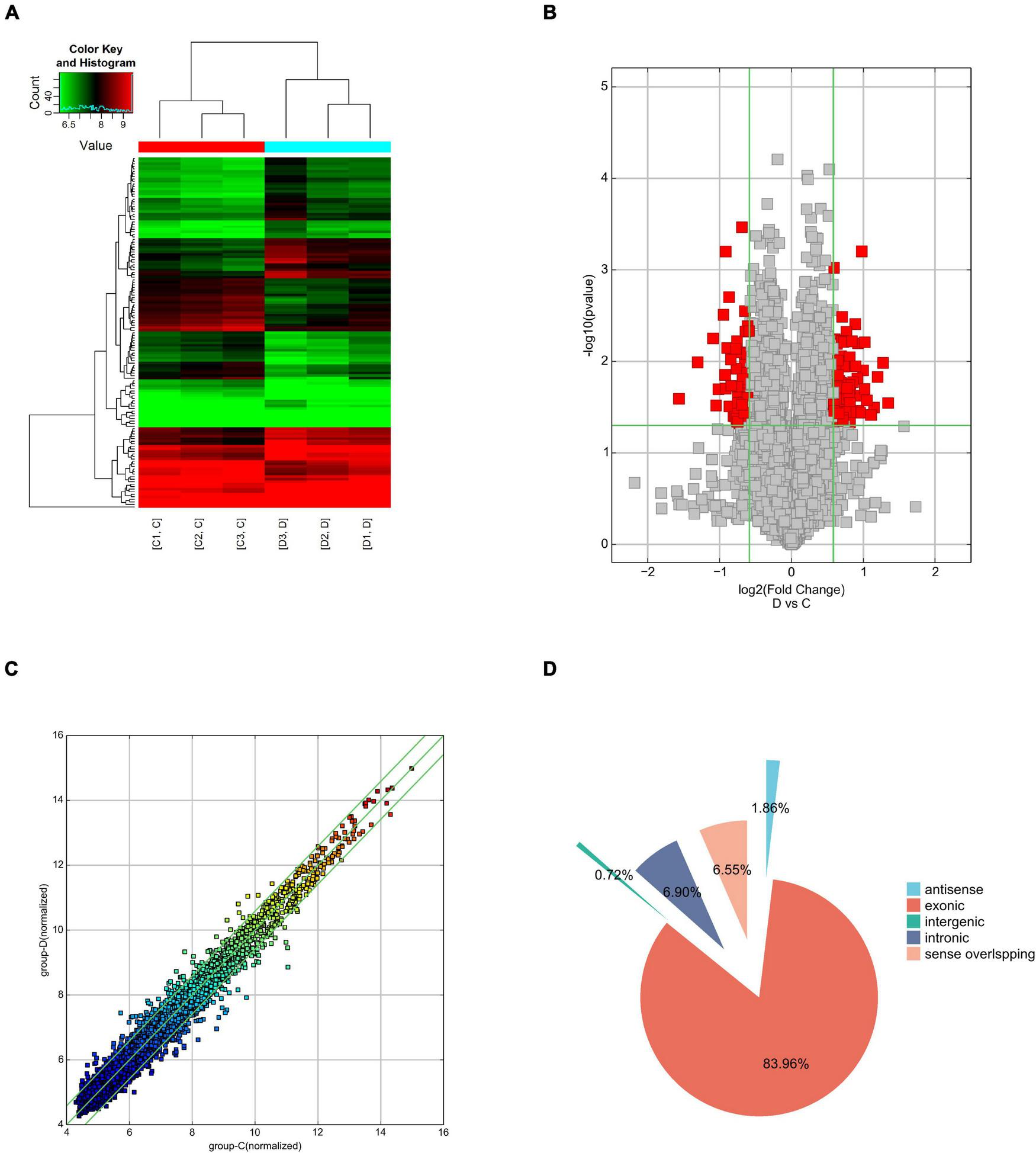 Figure 1. Overview of the circular RNA (circRNA) microarray expression data. (A) Hierarchical clustering of the differentially expressed circRNA expression data in the PD group and control group, and upregulated and downregulated circRNAs are colored in red and green, respectively. (B) Volcano plot of the differentially expressed circRNAs in the PD group and control group. The vertical green lines indicate a 2.0-fold (log2-scaled) up and down, respectively. The horizontal green line represents P = 0.05 (–log10-scaled). The red squares in the plot represent the differentially expressed circRNAs with statistical significance. (C) The scatter plot reveals the variation in circRNA expression between the PD group and control group. The X and Y values on the scatter plot are the average normalized signal values, shown on a log2 scale. The green fold-change lines represent 2-fold changes, thus circRNAs above or below the green lines indicate >2.0-fold upregulation or downregulation. (D) Classification of circRNAs in the PD group and control group.