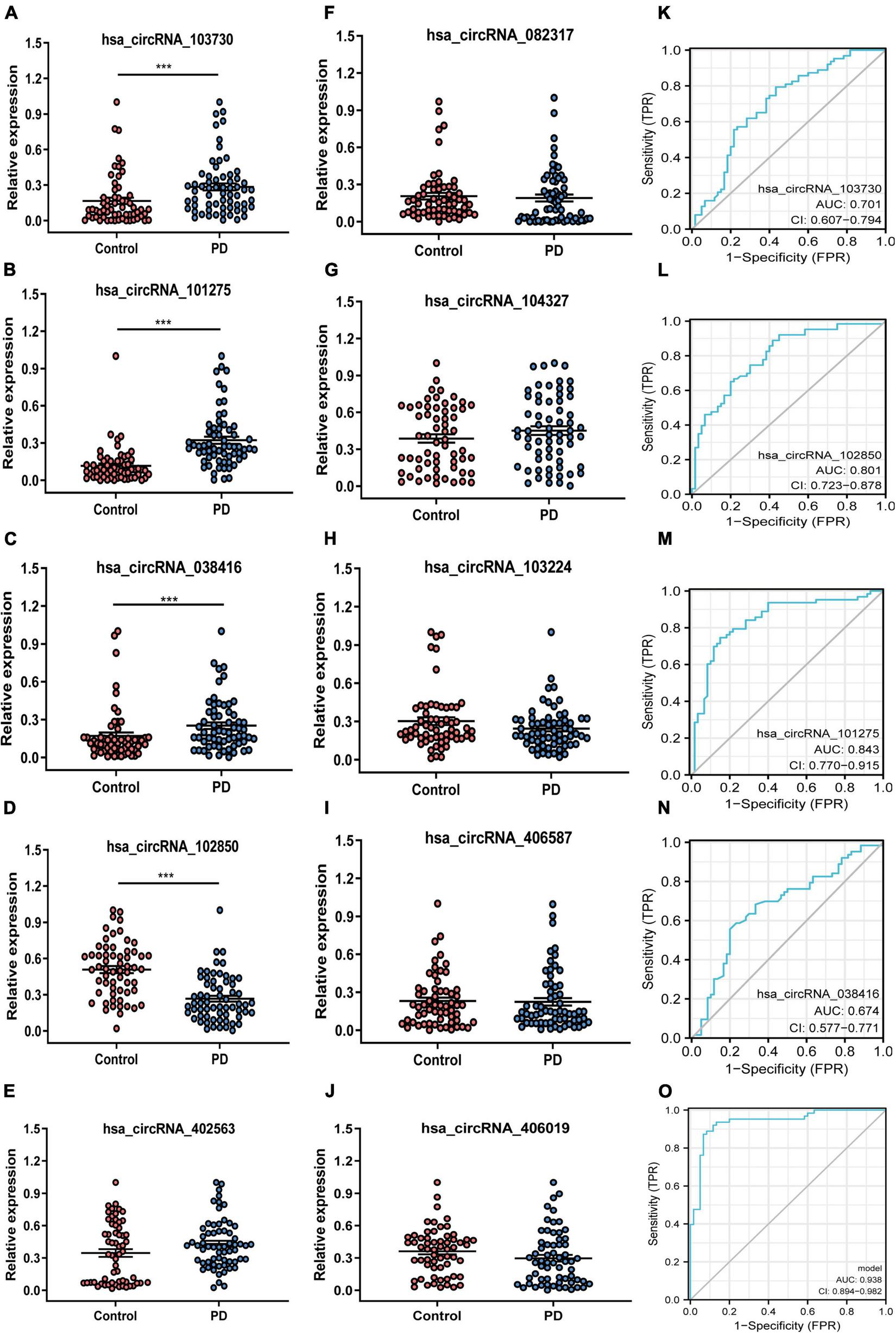 Figure 2. Expression profile and ROC curves for circRNAs in patients with PD and healthy controls peripheral blood sample. (A–J) The relative expression level of ten candidate circRNAs in patients with PD and healthy control using RT-qPCR detection. (K–O) ROC analysis of the four differentially expressed circRNAs in peripheral blood samples. PD, Parkinson’s disease; control, healthy controls; circRNA, circular RNA; hsa, homo sapiens; AUC, the area under the curve; TPR, true positive rate; FPR, false-positive rate. ***p-value < 0.001.