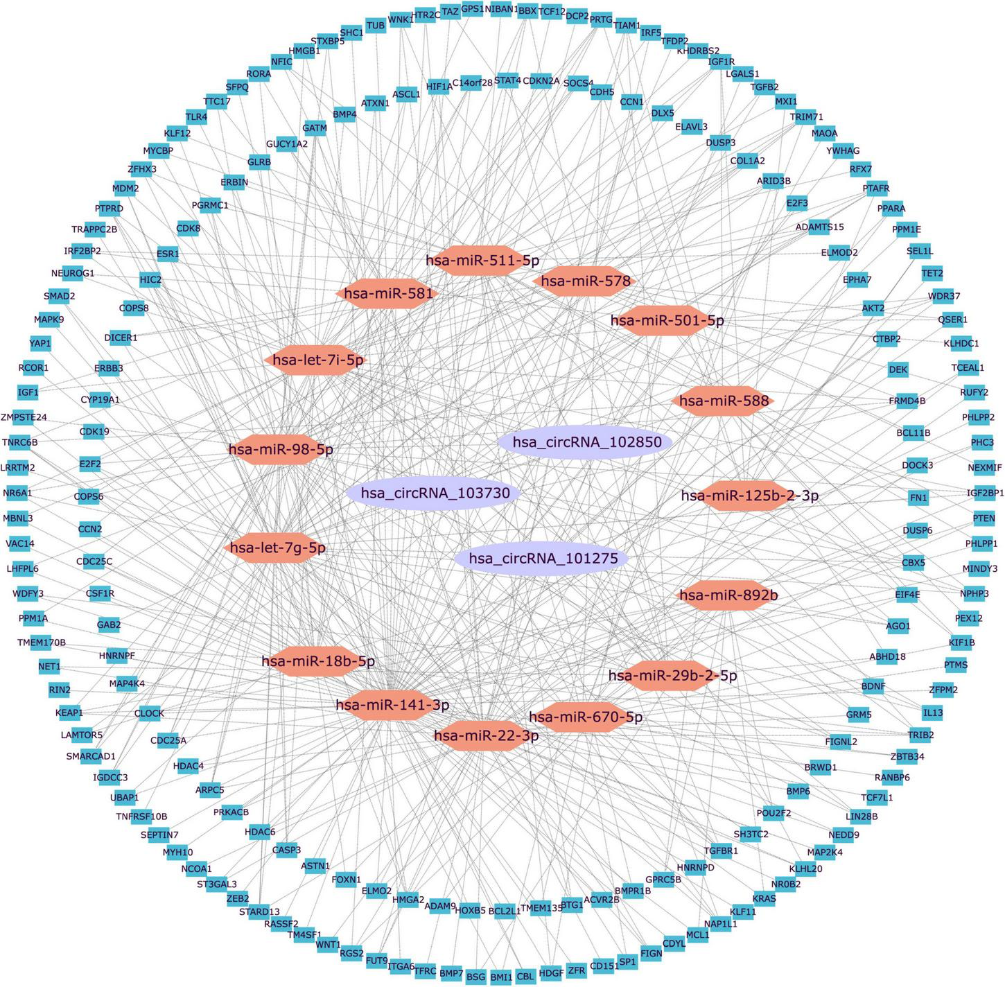 Figure 3. The visualization of the circRNA–miRNA–mRNA regulation network. The circRNA–miRNA–mRNA network was constructed based on three circRNAs, 15 miRNAs, and 200 mRNAs. circRNAs were plotted as purple ellipses, miRNAs were plotted as orange hexagons, and mRNAs were plotted as blue squares. miR, microRNA; circRNA, circular RNA.