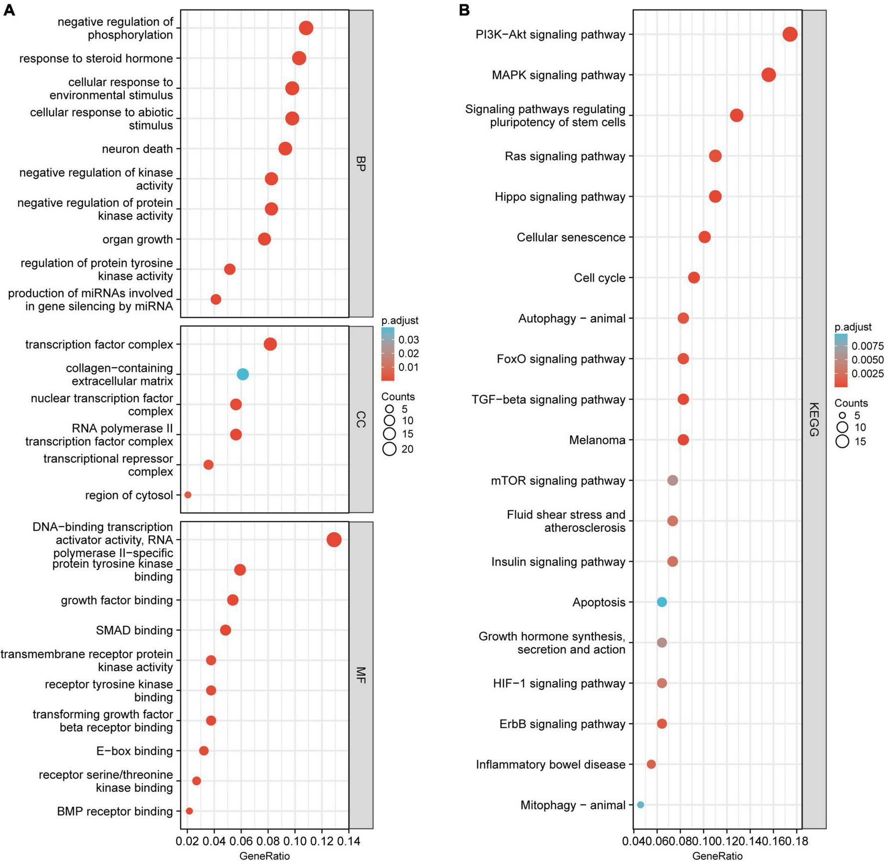 The GO and KEGG enrichment analyses were conducted to investigate the biological function of the candidate circRNAs. The GO analysis indicated that the 200 mRNAs were mainly enriched in negative regulation of phosphorylation, cellular response to environmental stimulus, response to a steroid hormone, transcription factor complex, collagen-containing extracellular matrix, and nuclear transcription factor complex (Figure 4A). The PI3K–Akt signaling pathway and MAPK signaling pathway were found to have significant enrichment in the KEGG pathway analysis (Figure 4B).