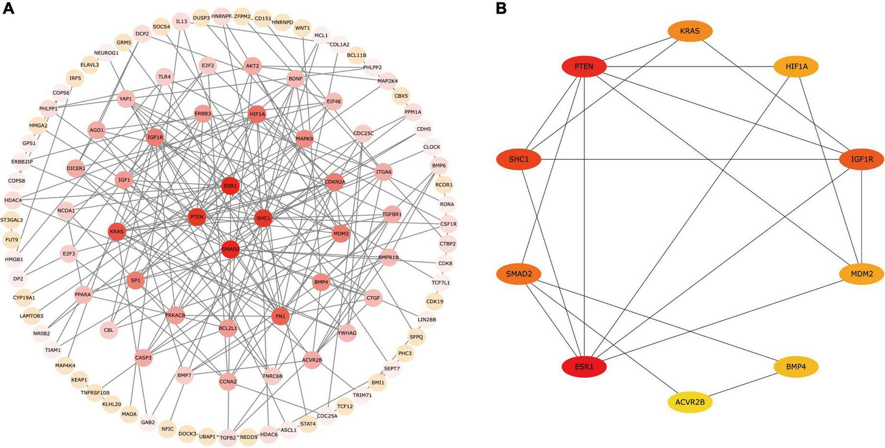 We constructed a PPI network according to circRNA–miRNA–mRNA interaction analysis. The PPI networks identified 107 proteins and 200 edges of the candidate circRNA networks that may be involved in PD (Figure 5A). We used the cytoHubba plugin to find the critical genes in the process of PD pathogenesis and obtained a sub-network containing 10 genes, including ESR1, PTEN, SHC1, IGF1R, SMAD2, KRAS, MDM2, HIF1A, BMP4, and ACVR2B (Figure 5B). The results of PPI interaction networks showed that ESR1, PTEN, and SHC1 may be involved in PD as the most important targets.