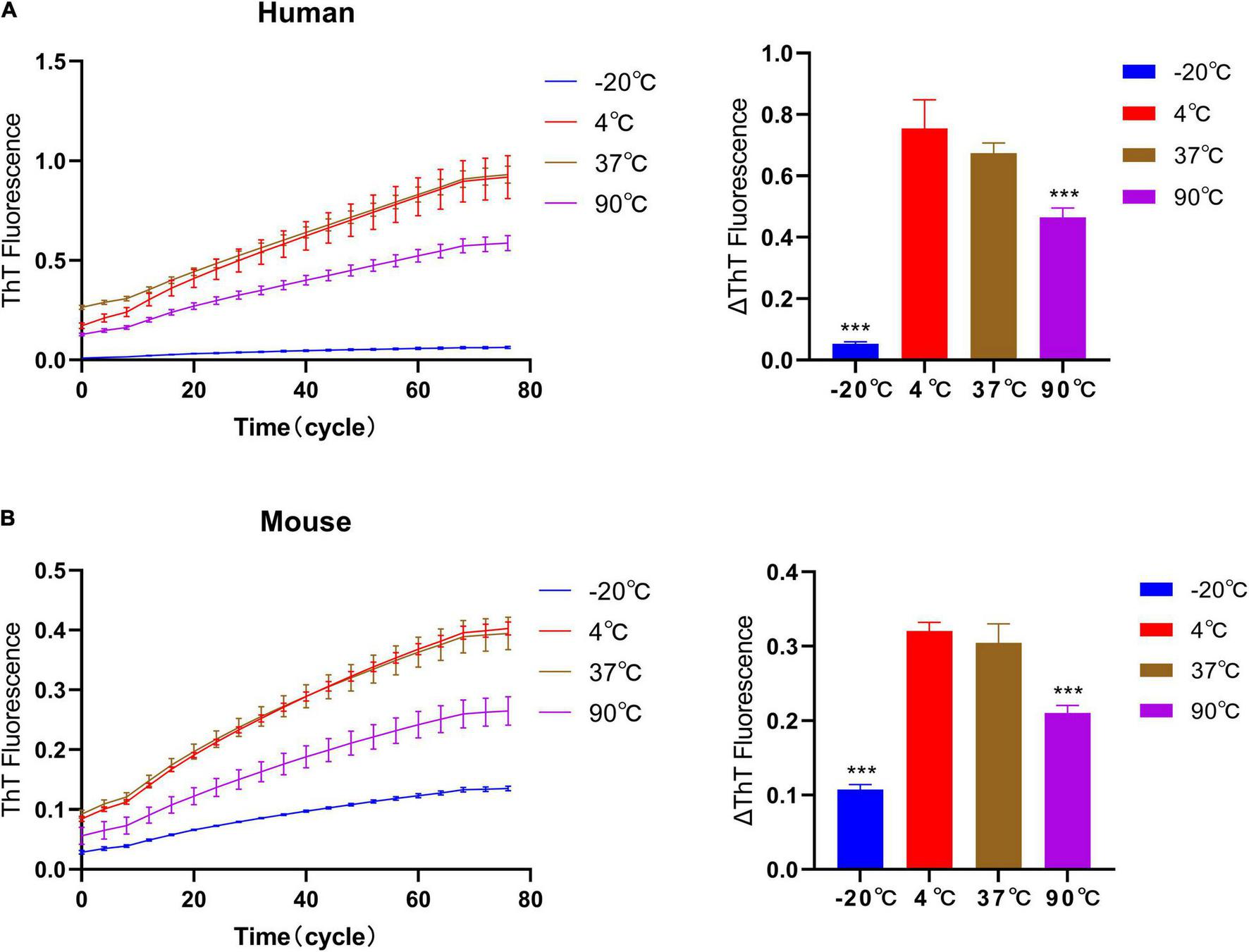 Figure 5. Effect of temperature pretreatment of fibril seeds on quiescent incubation curve. The human and mouse fibril seeds were pre-incubated under different temperature conditions (–20°C, 4°C, 37°C, and 90°C) for 2 h, then incubated with homologous monomers under 37°C. (A) The effect of temperature pretreatment of human seeds on the quiescent incubation curve, left. Corresponding ΔThT fluorescence value, right. (B) Effect of temperature pretreatment of mouse seeds on quiescent incubation curves, left. Corresponding ΔThT fluorescence value, right. Human and mouse α-synuclein fibril seeds still have the self-recruitment ability even after treatment at 90°C. After being treated at –20°C, the self-recruitment ability decreased significantly. All data are expressed in mean ± SD. Compared with the 37°C group, ***P < 0.001.