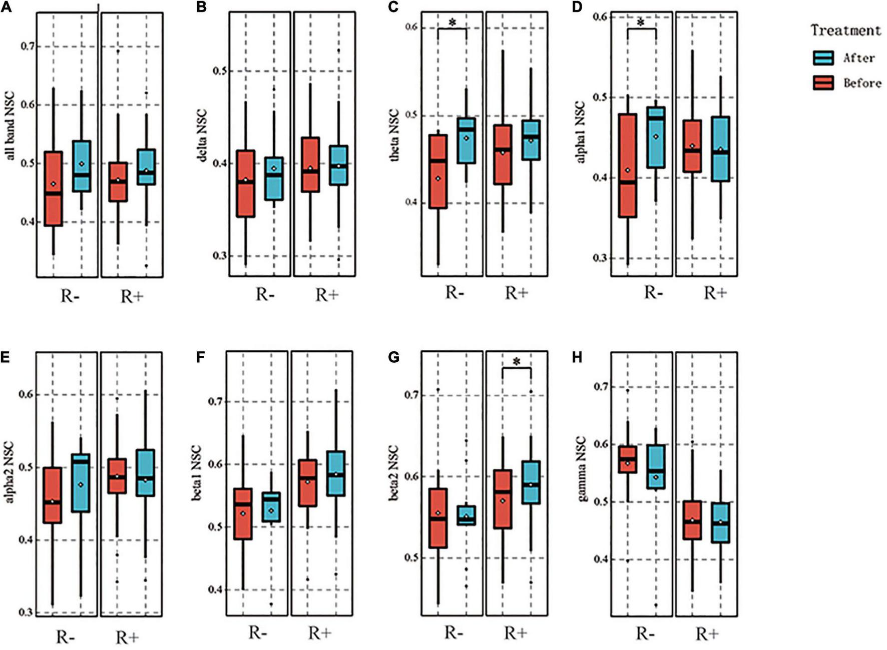 Results of normalized spatial complexity (NSC) for each frequency band. For the R- and R + group, the NSC of the all frequency band was not significantly different between before and after stimulation, p = 0.206, 0.084 (A). Delta band did not differ between before and after stimulation, p = 0.708, 0.448, respectively (B). Theta band was not significantly different for the R + group, p = 0.071; the R- group was higher after stimulation than before stimulation, p = 0.024. (C). In the alpha1 band, no significant difference was found in the R + group between before and after stimulation, p = 0.608, and the R- group increased after stimulation, p = 0.035 (D). Alpha2 band also showed no significant difference between before and after stimulation for the two groups, p = 0.504, 0.127, respectively (E). In the beta1 band, no significant difference was found between the two groups before and after stimulation, p = 0.370 and 0.756, respectively (F). In the beta2 band, the R + group showed an increase compared to the pre-stimulation, p = 0.030, and the R- group showed no difference, p = 0.849 (G). In the gamma band, no difference was observed between the two groups, p = 0.122 and 0.468, respectively (H). *p < 0.05.