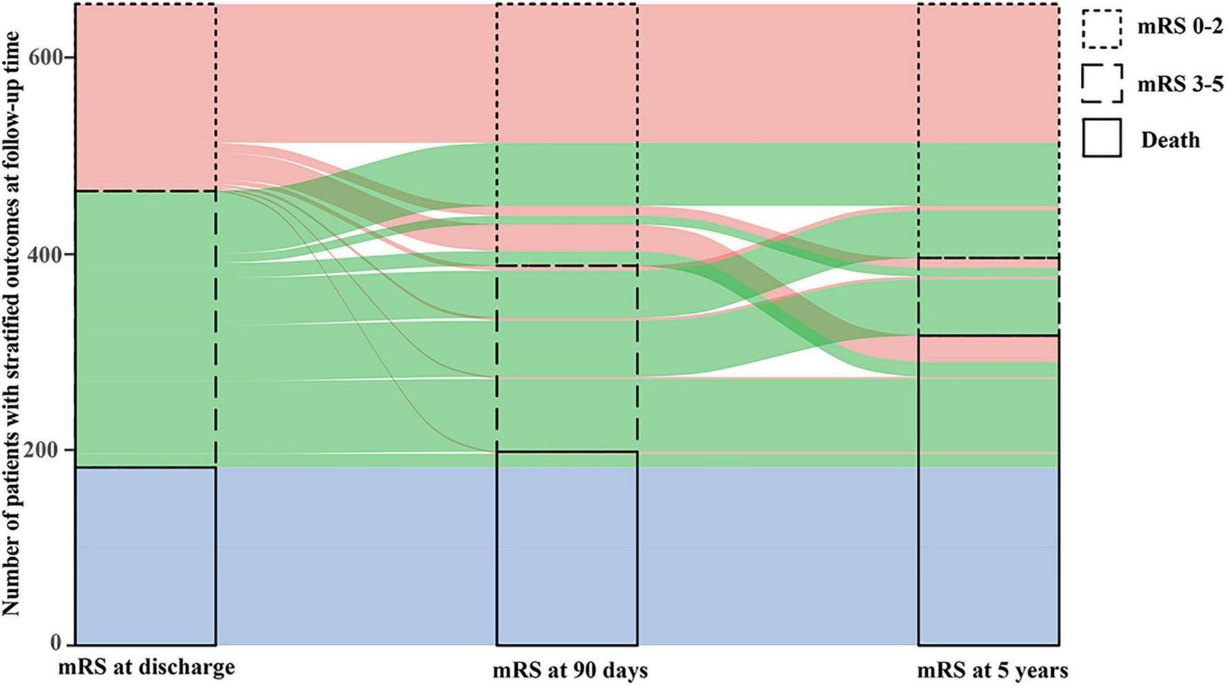 Figure 2 shows the transformation of outcomes at different follow-up time. Among available 269 patients who had follow-up data within 5 years and obtained functional independence at 90 days, 208 (77.3%) maintained good outcome, 19 (7.1%) developed disability (mRS 3–5) and 42 (15.6%) died at 5 years. Among available 189 patients with disability at 90 days, 53 (28.0%) obtained functional independence, 60 (31.7%) maintained and 76 (40.2%) died within 5 years. At 5 years, 261 patients (39.7%) had a good functional outcome, 317 patients (48.2%) died and 129 (28.2%) had stroke recurrence (Figure 3 and Supplementary Table 1).