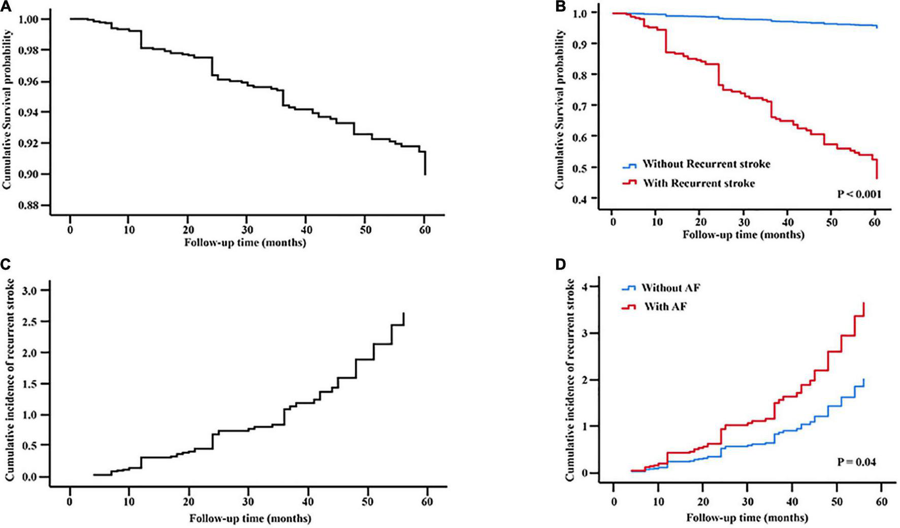 Multivariate Cox regression analysis. Cumulative survival probability were plotted according to (A) all patients and recurrent stroke presence (B) in all patients. Cumulative incidence curves of recurrence stroke were plotted according to (C) all patients and AF presence (D) in all patients. AF, atrial fibrillation.