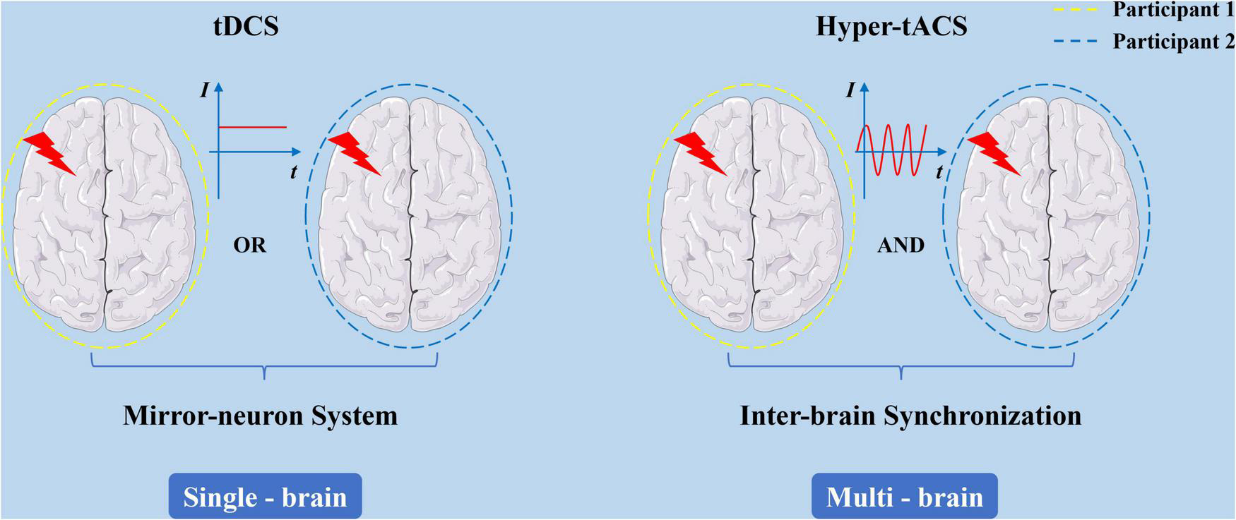 It has been found, according to the underlying neural mechanism of teamwork, that it is feasible to modulate brain function through external stimulation to change cooperative behavioral performance between team members. However, as shown in Figure 2, there are different intervention models between tDCS and tACS (hyper-tACS) for improving cooperative behavior. The main characteristic of IBS is synchronous nerve oscillations between multiple brains, while the stimulation of tDCS is characterized by direct current interference in a particular brain region, and seems unable to directly induce the synchronization of the corresponding brain region through neural entraining. Enticott et al. (2012) found that tDCS intervention of brain regions (inferior frontal gyrus) involved in the mirror neuron system in healthy individuals enhanced interpersonal motor resonance. The mirror neuron system plays an important role in imitation activities, interpersonal learning, and other behaviors (Oberman et al., 2007; Mainieri et al., 2013; Meng Yuan et al., 2018), and autism is considered in part to be related to dysfunction in the mirror neuron system (Hamilton, 2008). A previous study has shown that cathode tDCS significantly reduced musicians’ assessment of musical creativity, which was related to the mediating effect of empathy (Colombo et al., 2021). Anodal tDCS intervention on the right inferior frontal gyrus of healthy subjects is thought to induce imitative behavior in social interaction (Hogeveen et al., 2015). Therefore, although tDCS cannot directly regulate the neural oscillation rhythm in a particular brain region across multiple brains, it could modulate the cooperative behavior of subjects by intervening in the mirror neuron system, which is closely related to cooperation and teamwork. Additionally, as a crucial part in rapid instructed task learning related with teamwork (Meiran et al., 2016), working memory was also proved to be effectively improved by tDCS and other transcranial electrical stimulation, which would provide a way to enhance teamwork (Ke et al., 2019; Nissim et al., 2019; Zeng et al., 2022). However, the nature of cooperative behavior still probably lies in the occurrence and development of multi-brain IBS. Using tACS technology would provide more possibilities for future research into the influence of different frequency and phase parameters on teamwork behavior.