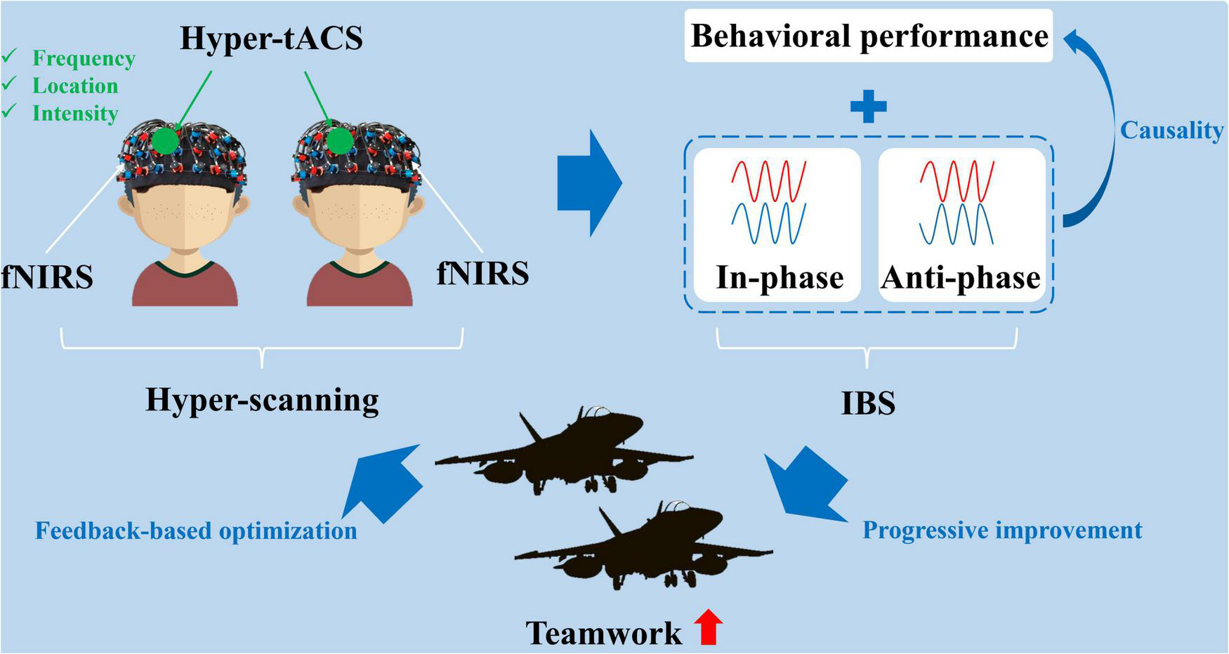 In this review, we have clarified the model of teamwork among military pilots and provided an underlying explanation for the neural mechanism of teamwork. However, although IBS is known to be closely related to cooperative behavior, the question of causality is not clear. Thus, we hypothesize that transcranial electrical stimulation could be applied to directly stimulate brain regions related to teamwork to enhance IBS among multiple members in a team, and the causal link between IBS and cooperative behavior would then be clarified. Furthermore, it is crucial for military pilots to improve their teamwork by either tDCS or hyper-tACS. We therefore provided a feasible study design as a basis for an enhancement strategy. The hyper-scanning and hyper-tACS could provide a possible way for military pilots to enhance their capability for teamwork and would help us better explore the relationship between synchronous oscillation and cooperative behavior. We hope this review can provide some theoretical inspiration for future research on improving the combat effectiveness of military pilot teams, and we put forward suggestions on the basis of current research to improve relevant study designs in the future.