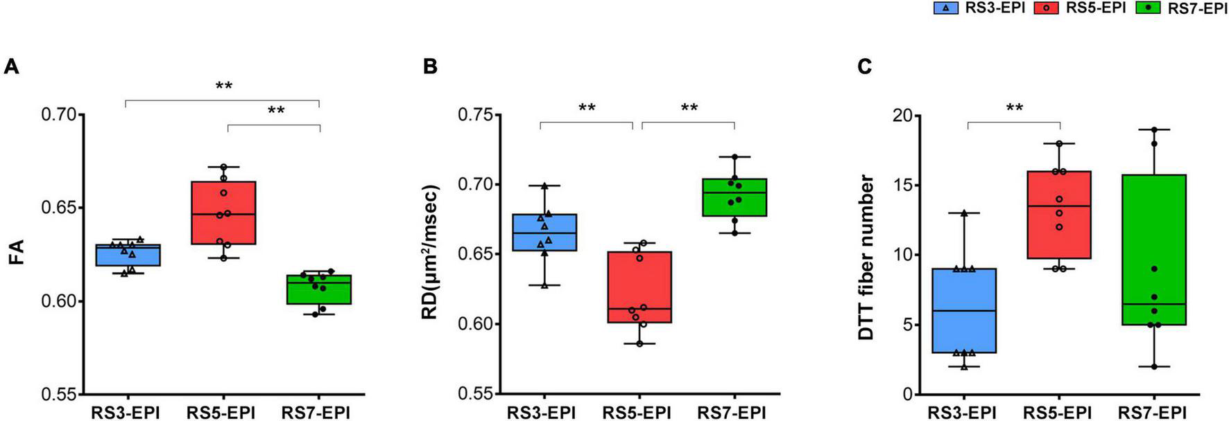 Box plot comparing FA, RD, and DTT fiber numbers for RS3-EPI, RS5-EPI, and RS7-EPI. RS5-EPI yielded higher FA and lower RD than RS3-EPI and RS7-EPI (A,B). The DTT fiber number generated by RS5-EPI was significantly higher than RS3-EPI (C). **P ≤ 0.017, post hoc analysis with Bonferroni corrected.