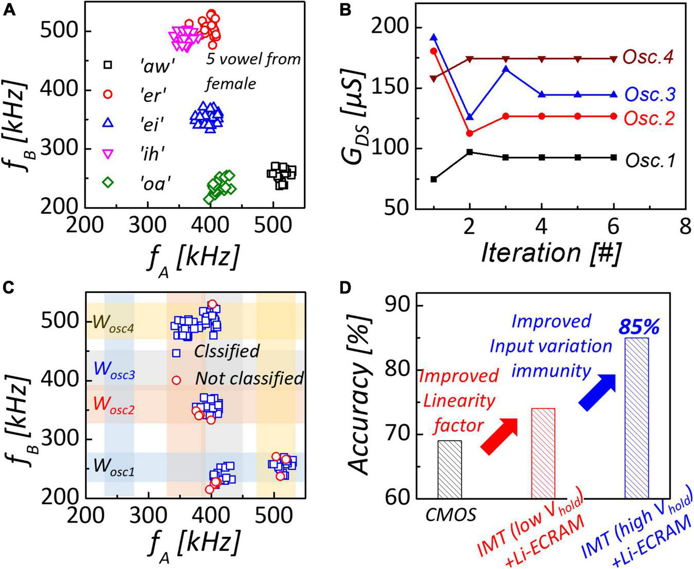 (A) Dataset of spoken vowel. Formant frequencies of spoken vowel is processed by linear transformation to match frequency of NbO2-based oscillator with Li-ECRAM. (B) Conductance of Li-ECRAMs as function of training iteration. After five iterations, channel conductance of Li-ECRAMs converge to the optimal value. (C) Synchronization map after training. Most of clustered data are covered by classifiable region. (D) Introducing Li-ECRAM and adjusting Vhold of NbO2, 85% classification accuracy can be obtained.