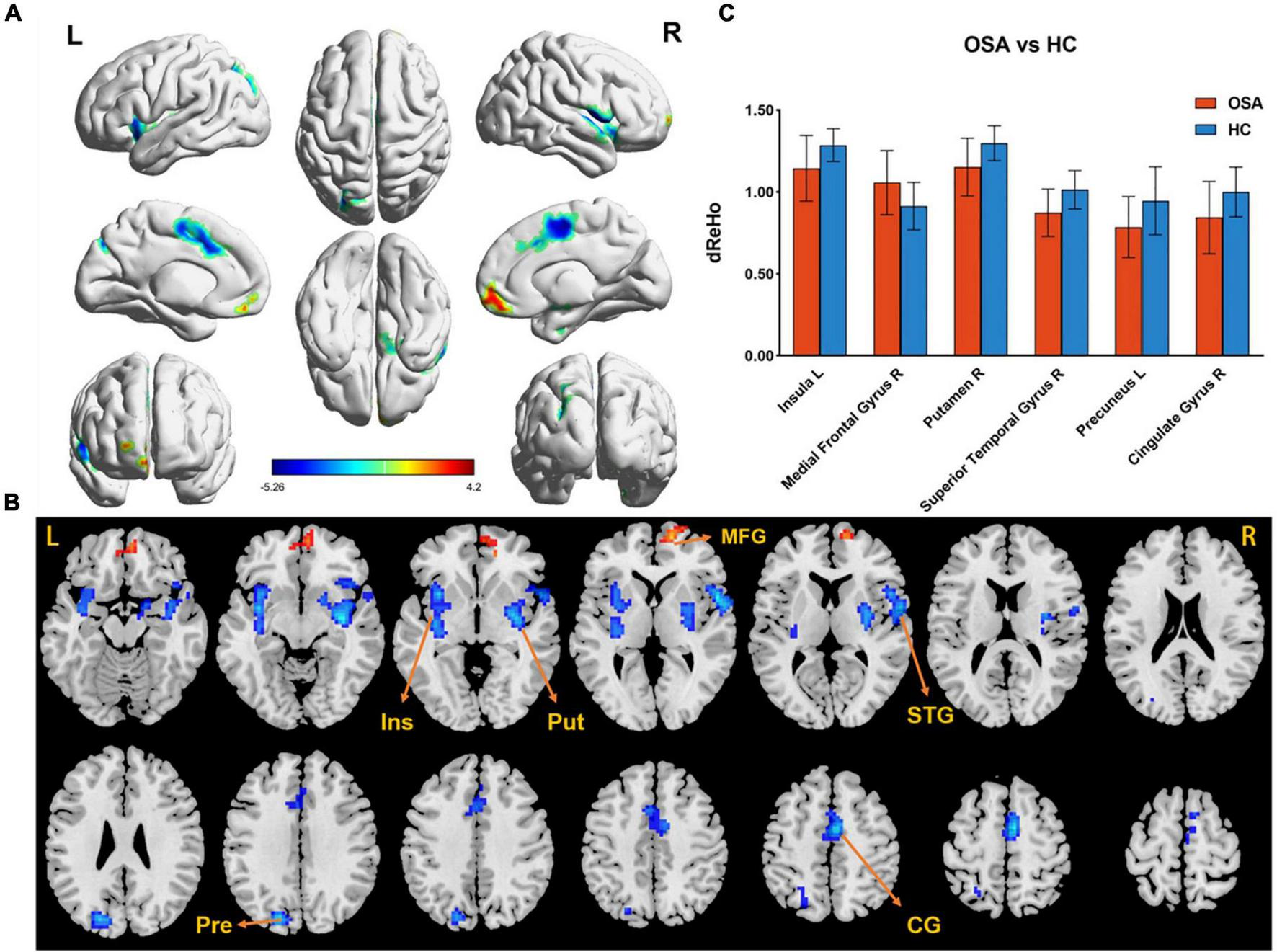 (A,B) The differences in dReHo between the OSA patients and HCs (after GRF correction voxel-wise p < 0.01, cluster-wise p < 0.05, two-tailed). The color bar indicates the t-value. (C) The histogram indicates mean value of dReHo variability between the two groups. Detailed information about these altered regions are described in Table 2. L, left; R, right; dReHo, dynamic regional homogeneity; Ins, Insula; Put, Putamen; MTG, Medial Frontal Gyrus; STG, Superior Temporal Gyrus; Pre, Precuneus; CG, Cingulate Gyrus.