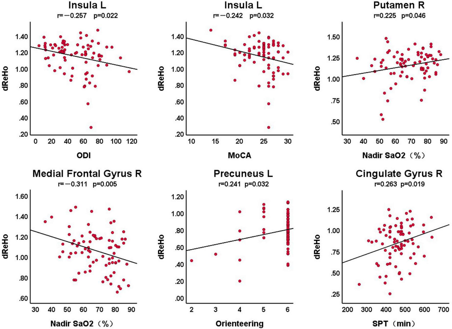 Figure 2 shows the correlation between dReHo in abnormal brain areas and clinical variables in patients with OSA, with a statistically significant difference of P < 0.05. We found that there was a significant correlation between the left insula and ODI (r = –0.257, P = 0.022), the total score of MoCA (r = –0.242, P = 0.032), the right putamen and nadir SaO2 (r = 0.225, P = 0.046), the right medial frontal gyrus and nadir SaO2 (r = –0.311, P = 0.005), the left precuneus and the orientation of the MoCA scale (r = 0.241, P = 0.032), and the right cingulate gyrus with the SPT (r = 0.263, P = 0.019).