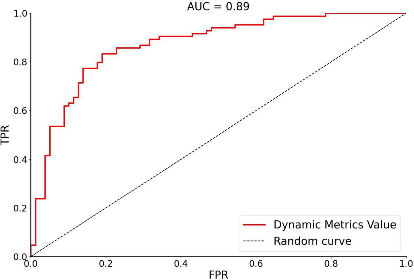 The receiver operating characteristic curve of dynamic metrics. The image of ROC was displayed using Python software. Accuracy of 81.60%, Precision of 81.01%, Sensitivity of 81.01%, Specificity of 82.14%, and area under the curve (AUC) of 0.89. FPR, false positivity rate; TPR, true positivity rate; AUC, area under the receiver operating characteristic curve.