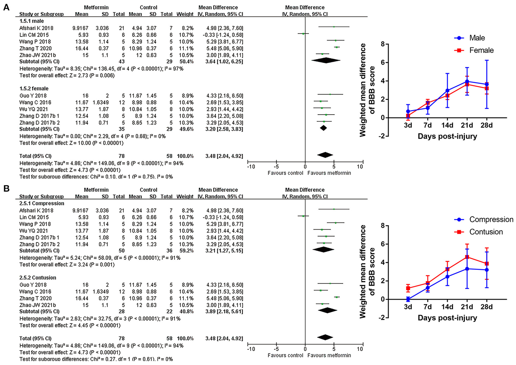 Of the 12 publications from 2015 to 2021, 10 were presented in English, the other two in Chinese (Guo et al., 2019; Zhao et al., 2021). The sample size ranged from 18 to 114 animals. Seven publications demonstrated an SCI model induced by aneurysm clip compression, and the others used a weight-drop impactor method (Wang et al., 2016; Guo et al., 2018, 2019; Zhang et al., 2020; Zhao et al., 2021). All studies caused trauma at the T7–T11 level. Eight studies reported the source of metformin (Lin et al., 2015; Wang et al., 2016, 2018; Zhang et al., 2017a,b; Afshari et al., 2018; Guo et al., 2019; Wu et al., 2021). The placebo controls included saline and dimethyl sulfoxide diluted with saline. Metformin dose ranged from 10 to 320 mg/kg, and all studies used intraperitoneal injection except Lin et al. (2015). Most studies injected metformin immediately post injury, while five studies treated SCI from the 1st day or 1st week after trauma (Lin et al., 2015; Wang et al., 2016; Guo et al., 2018; Zhang et al., 2020; Zhao et al., 2021). Ten studies applied repeated administration of metformin, once daily for 3–28 days after SCI, whereas a single dose of metformin was employed in the remaining studies (Table 1; Afshari et al., 2018; Wang et al., 2018).