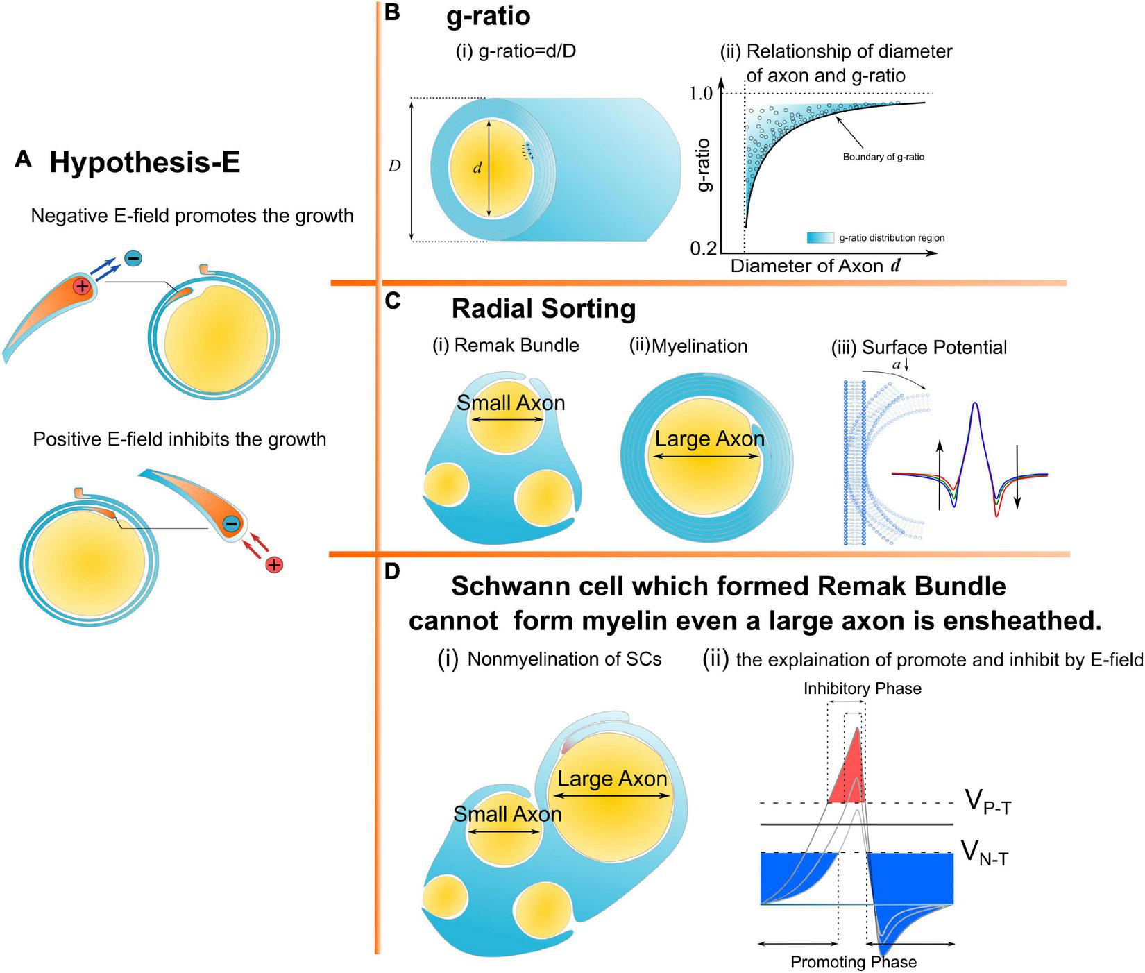 A series of morphological characteristics of myelin explained a mathematical and physical perspective. (A) Hypothesis-E: The effect of E-field on myelin growth; (B,C) phenomena explained by Hypothesis-E: (B) g-ratio: The thickness of myelin sheath has a specific relationship with the diameter of the axon. (C) Radial Sorting: Myelin selectively myelinated axon based on axonal diameter; (D) SC of remak bundle cannot form myelin even when a large axon is ensheathed.