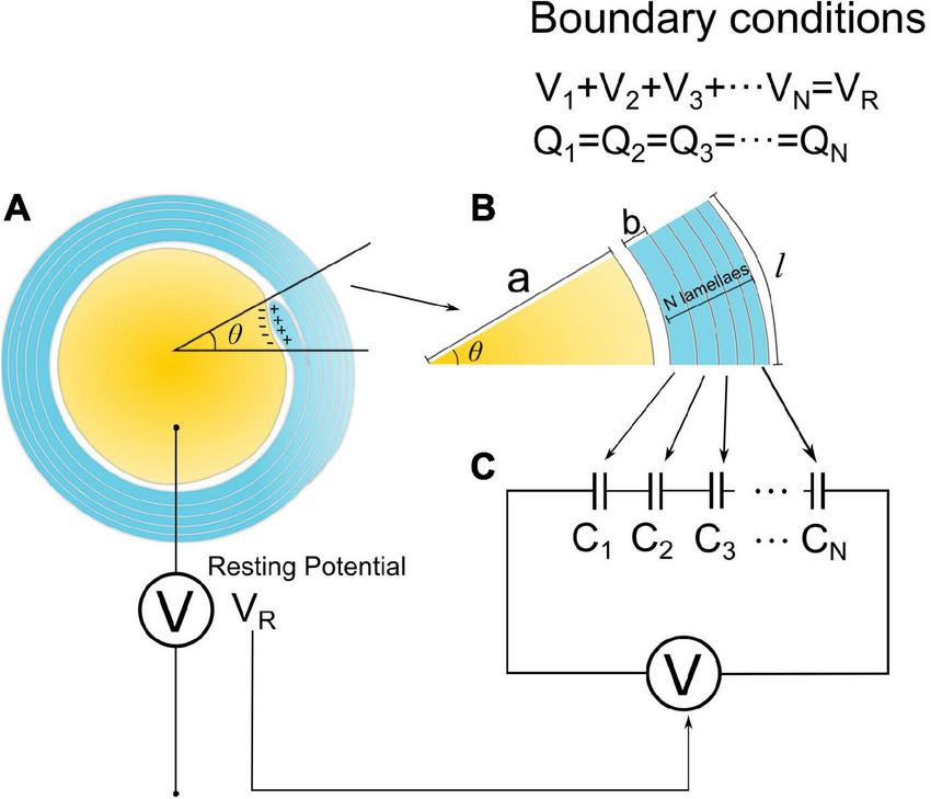 Figure 2B shows a mature myelinated axon with the number of myelin lamellae as N. The axonal radius is a, and the thickness of a single myelin lamella is b. Then the total myelin thickness, D, is b × N. We assume that the axonal cross-section is centrally symmetric. So we only simulate the local axon with a radial angle as θ, as shown in Figure 2B. The capacitance, C, of each layer is proportional to its area. Since the longitudinal length of each layer is identical, the capacitance of each layer is proportional to the arc length l: