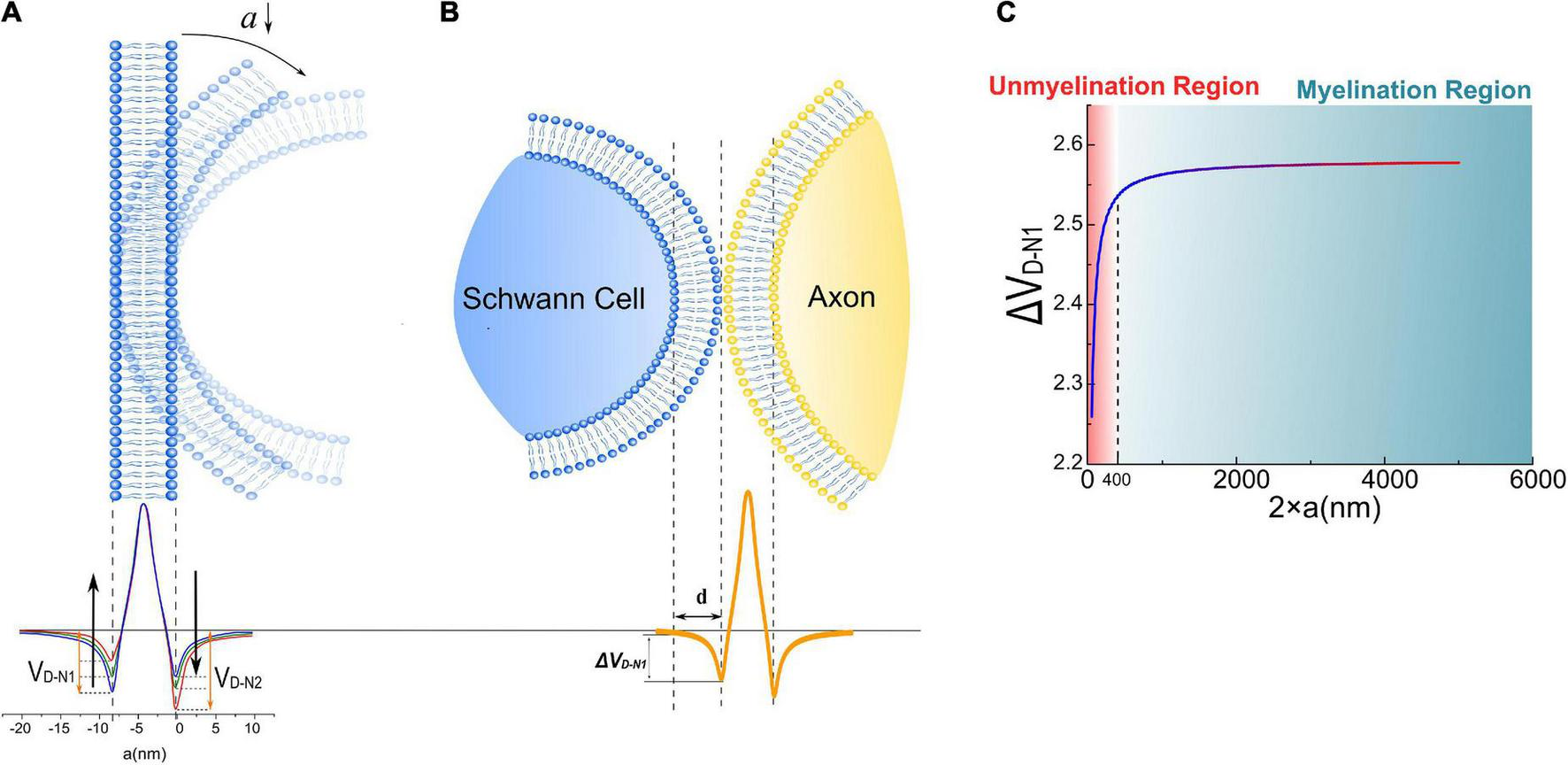 (A) The dipole potential generated by the bending of the cell membrane; (B) when a Schwann cell contact with the cell membrane of an axon, a portion of the surface potential, VD–N1, will be exerted upon Schwann cell’s membrane, labeled as Δ VD–N1; (C) the simulation result of Δ VD–N1 is a function of axonal diameters.