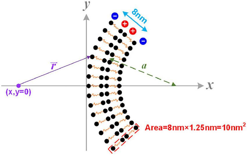 In Figure 4A, the axon membrane lipid bilayer consists of two layers of amphiphilic molecules. The positively charged hydrophobic tails of these lipids are directed toward the membrane center, while the negatively charged hydrophilic heads are directed toward the extra- and intracellular fluid (Monje, 2018). Each amphiphilic molecule is an electric dipole, a group of separated charges with opposite polarities. Thus, by arranging the position of each polar, the potential of a point as a function of the distance to the membrane can be calculated as shown in Figure 5. The arrangement of each polar is determined by the thickness of the bilayer and the diameter of the axon. Here axon radius, a, is a variable. The total thickness of the lipid bilayer is 8 nm, a typical value of a cell membrane. The length of the dipole of each amphiphilic molecule is 3.6 nm, while the distance between the two positively charged polar is 0.8 nm. The cross-sectional area of each group of molecules is 10 nm2. The charge quantity of the nth polar is qn. The route from nth polar to the specific point (x, y = 0) on the x-axis is . The total electric potential at the position (x, y = 0) is the sum of the potential from each polar, as below: