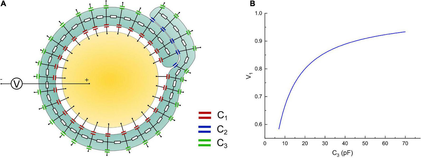 (A) A more detailed circuit model; (B) the voltage on the inner layer capacitor, C1, by increasing the capacitance of the outer layer, C3.