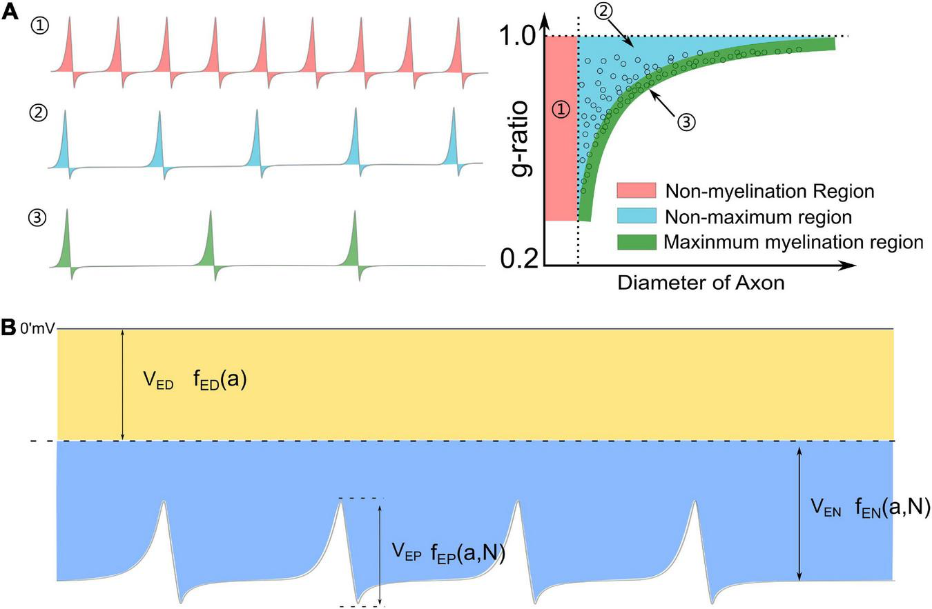 (A) The relationship between the frequency of action potential and the thickness of myelin: (1) An axon with a very high frequency of action potentials tends to be unmyelinated; (2) An axon with a medium frequency of action potentials cannot have maximum myelin thickness; (3) An axon with a very low frequency of action potentials tends to have maximum myelin thickness, forming the lower edge of the g-ratio data. (B) A complete perspective of Hypothesis-E: the total voltage consists of three major components: VED,VEN, and VEP.