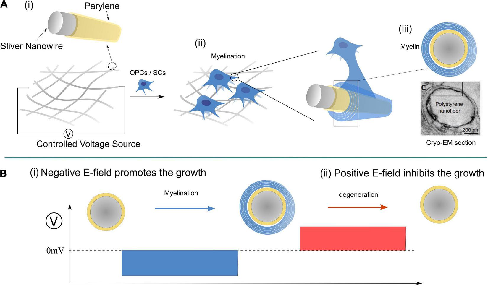 When SCs get close to the surfaces of axons, axons of larger caliber will exert a special “E-field,” which is more negative than that of the axons of smaller caliber, to the cell membrane of SCs. Thus, SCs tend to grow and wrap on larger axons. When the caliber of axons is lower than a threshold, the amplitude of the negative E-filed is too low to enable the growth of SCs on their surfaces.