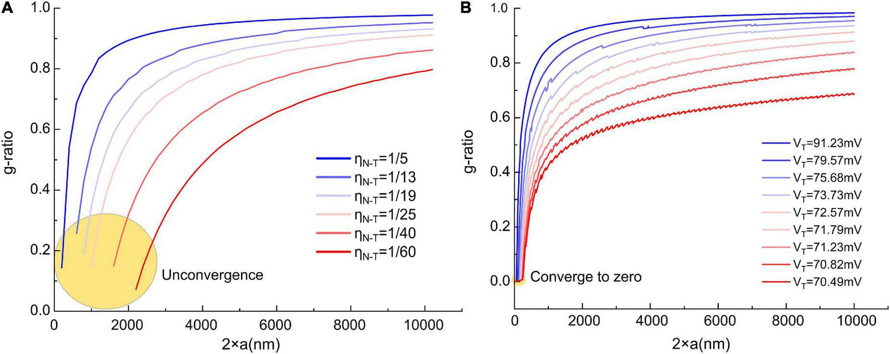 To enable calculating these two functions, we need to obtain the constant of b. Based on previous studies, we set b = 17 nm as a typical value (Nave and Werner, 2014). The g-ratio and Nmax simulation is shown in Figures 3A,B.