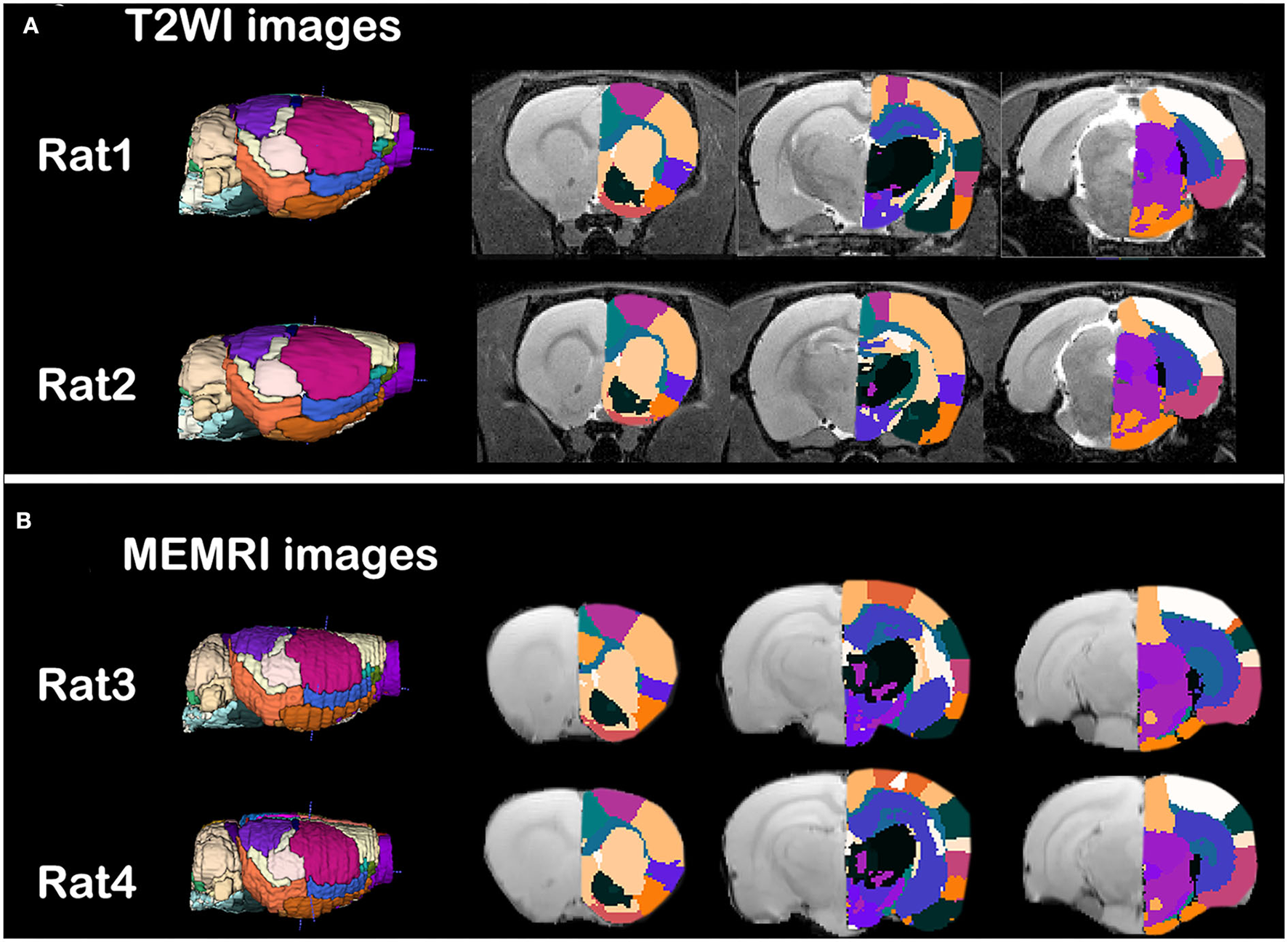 Qualitative evaluation of the individual parcellations of (A) T2WI images and (B) intercranial mean MEMRI images of rat brain. Four rats were randomly selected. Right side of the individual parcellations was shown in color scaled and superimposed on the corresponding MRI image. The T2WI/MEMRI MRI images were shown in gray scaled as background.