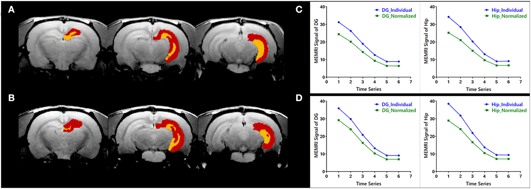 The evaluation of individual parcellations of two randomly selected MEMRI images was shown in Figure 3. Unilateral DG and Hip were superimposed on the first volume of MEMRI images (Figures 3A,B). The MEMRI time course in individual space was plotted out in blue color, while it in Paxinos space was in green (Figures 3C,D). As illustrated in Figure 3, although the downtrend of time courses was similar, the MEMRI voxel intensity in individual space was always higher than it in standardized space. It could be speculated that the inherent MEMRI signal could be persevered by individual parcellations.