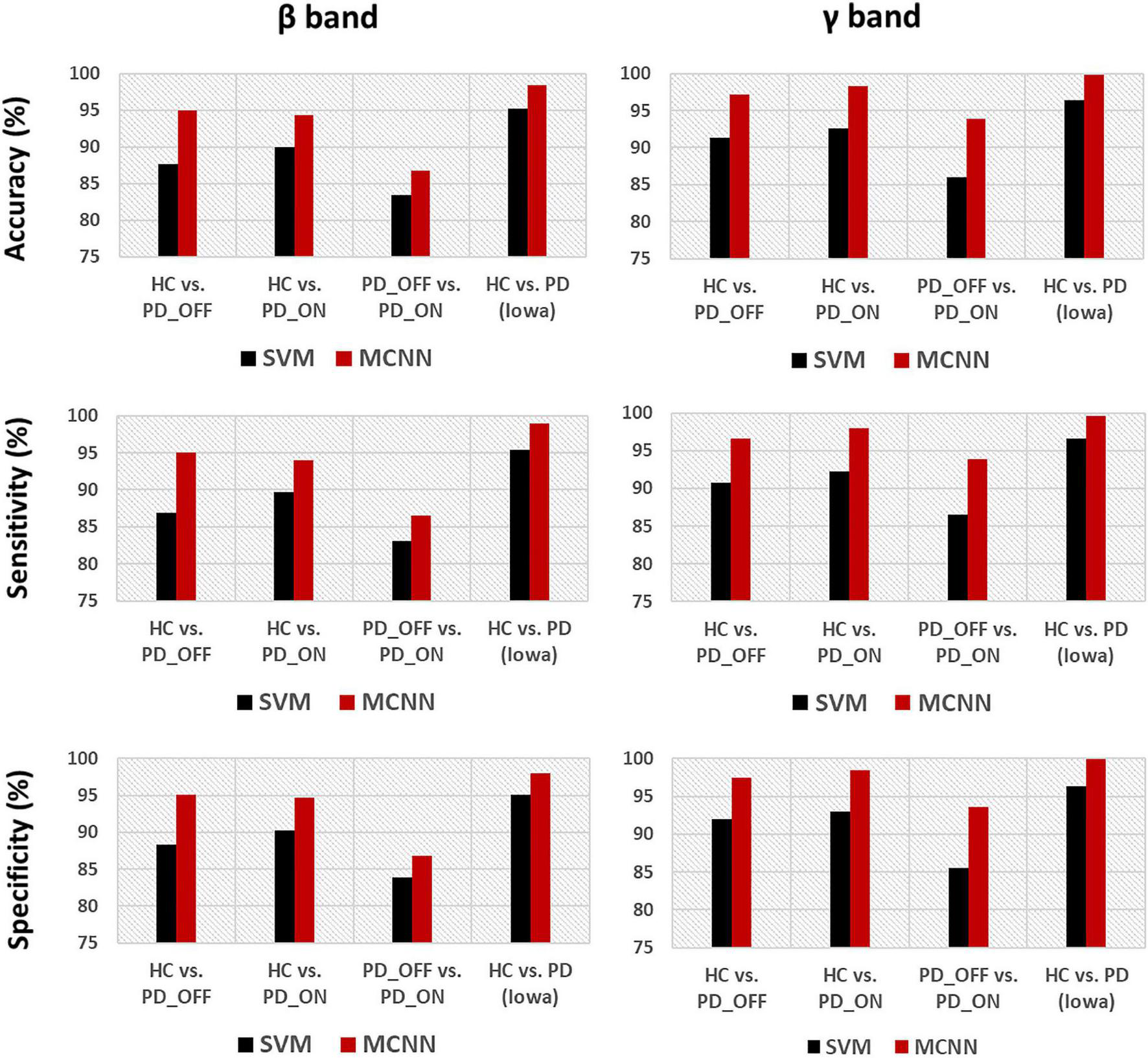 In the feature analysis, Student’s t-test is used to test the significance of differences in comparisons. In the classification experiments based on the UC San Diego dataset, we performed three sets of two-class classification using the SVM and MCNN models, respectively, for the HC group, PD_ON group, and PD_OFF group, and one set of three-class classifications using the MCNN model. In the classification based on the Iowa dataset, we used the SVM and MCNN models to classify the HC group and the PD group, respectively. Experimental results were evaluated using multiple metrics of accuracy, specificity, sensitivity, and ROC. All classification results are ten-fold cross-validation.