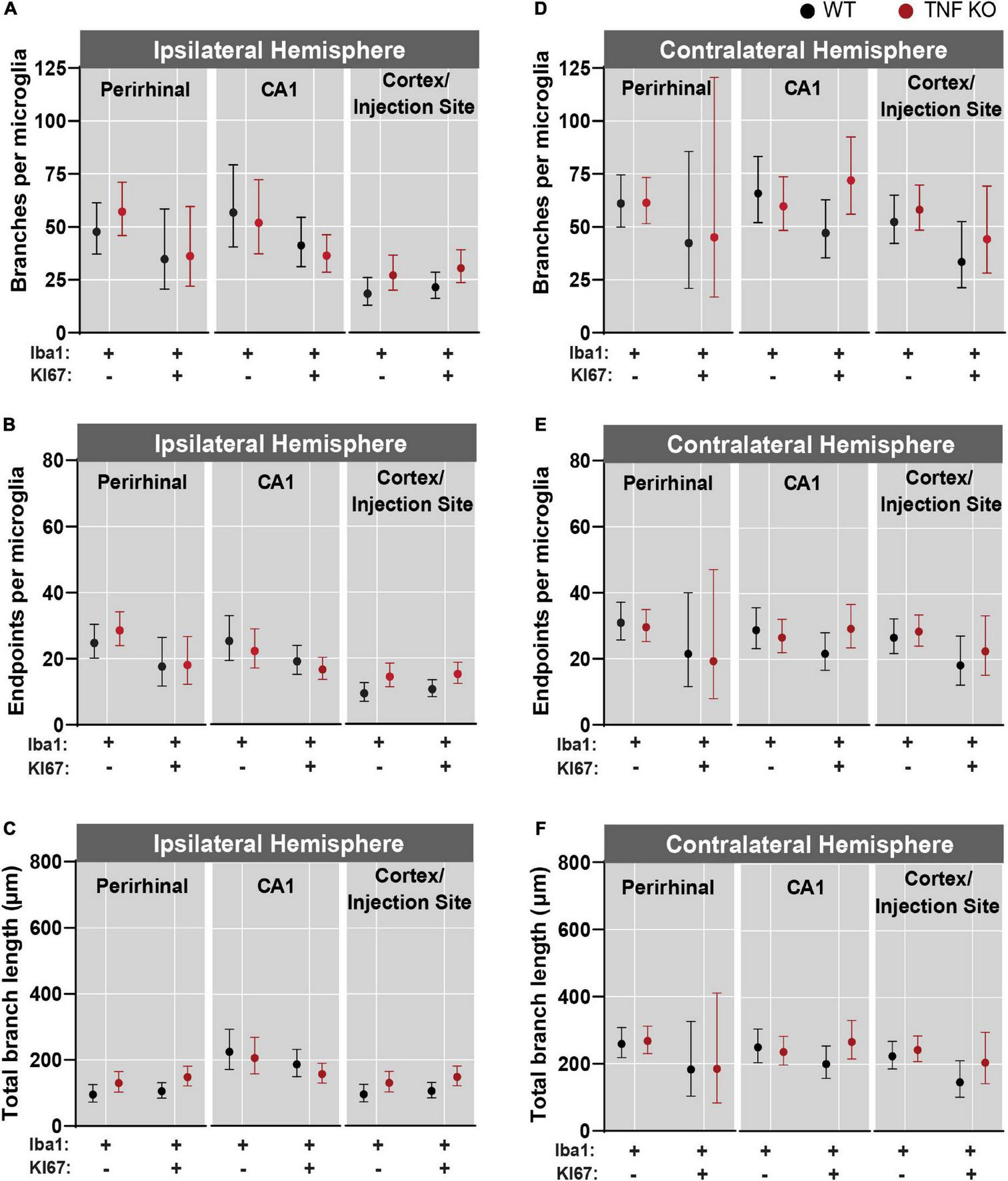 Prior to statistical analyses, Grubb’s outlier tests were run using the GraphPad outlier calculator and data points that were statistically significant (p < 0.05) outliers were excluded from further analyses. All measurements from isolated single cell microglia analyses had the following group sizes: WT KI67– 140 microglia, TNF-α KO KI67– 182 microglia, WT KI67+ 72 microglia, TNF-α KO KI67+ 88 microglia. For isolated single cell analyses, the microglia were randomly selected, independent of KI67 staining, resulting in differences in groups sizes between KI67+ and KI67– groups.