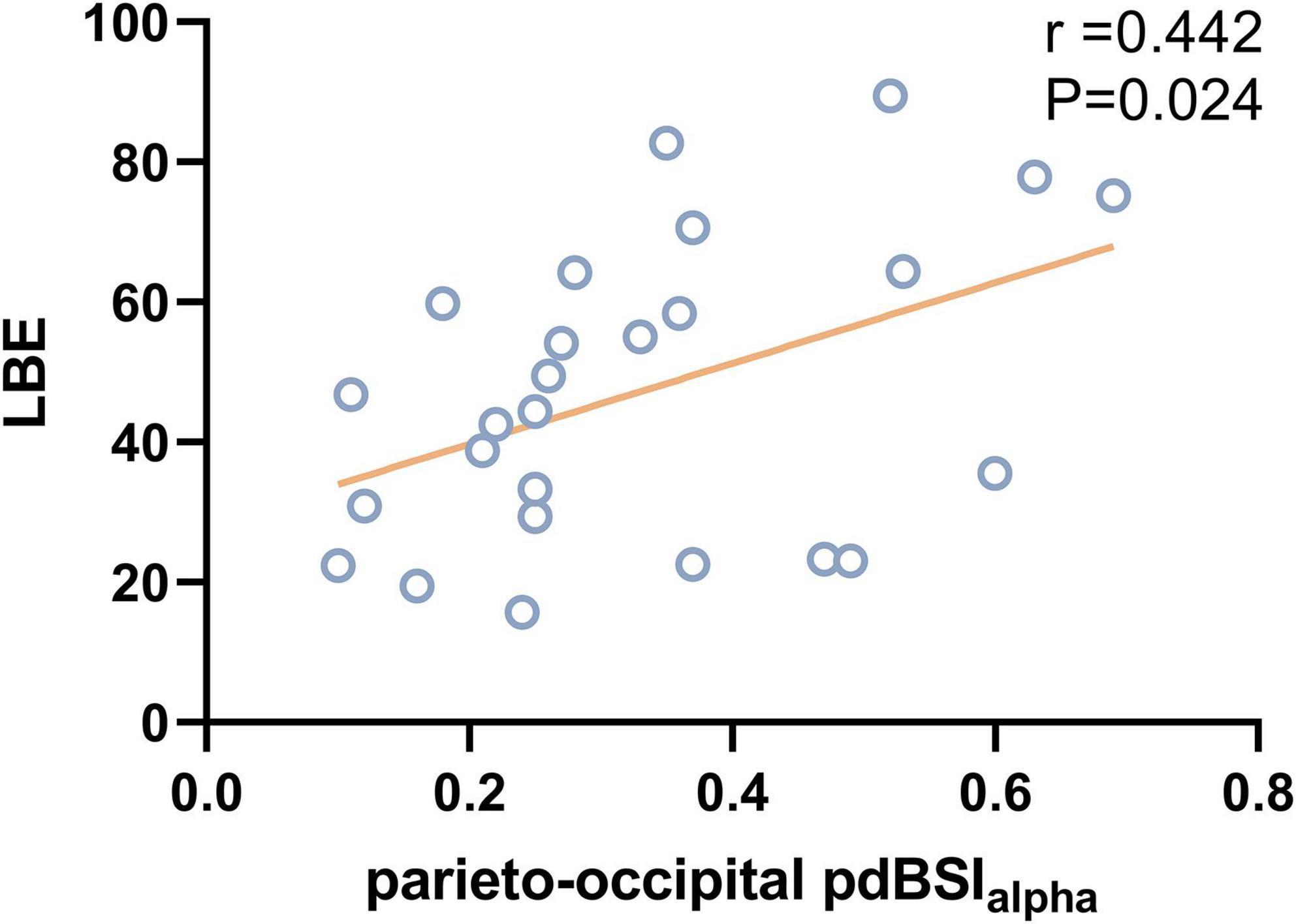 The DAR showed a trend toward a positive association with LBE (r = 0.458, P = 0.019). Furthermore, the DARAH showed a positive correlation with LBE (r = 0.483, P = 0.012) and ORS (r = 0.428, P = 0.029; see Figure 7). No correlation was found between the DAR and ORL. Parieto-occipital pdBSIalpha showed a trend toward a positive association with the LBE (r = 0.442, P = 0.024), but no correlation was found with the ORL or ORS (see Figure 8). There was no significant correlation between the pdBSI in the other frequency bands and the paper-pencil test.