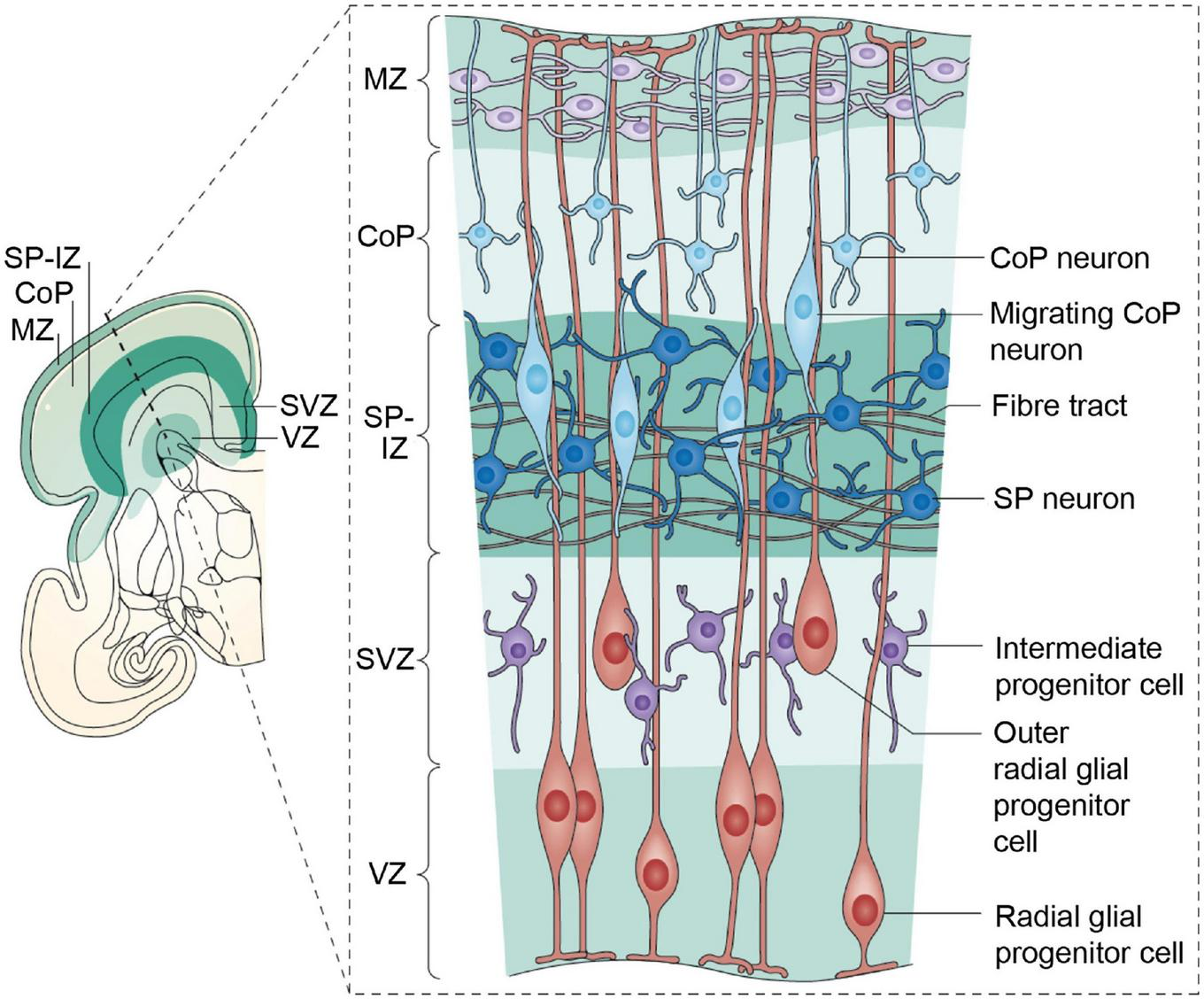Post-mitotic excitatory pyramidal neurons migrate along radial glial (RG) fibers in an inside-out gradient of development (the deepest cellular layers are built first, followed by the ones closest to the surface) from layer VIa to layer II to produce the cortical plate by GW7–20 (Figure 4). Pyramidal cells originate from radial glial cells (RGC) at the beginning of cortical plate development (GW7–8), but later, they mostly come from intermediate progenitor cells (IPC) or basal progenitors derived from RGC cells (Kriegstein and Noctor, 2004; Corbin et al., 2008). The first pyramidal neurons emerge successively from the ventricular zone (VZ) of the cortex, from which they migrate radially to shape a layer within the PP, i.e., the cortical plate (CP), dividing the PP into two zones: the superficial marginal zone (MZ; presumptive layer I containing the CR cells) and the deep SP.
