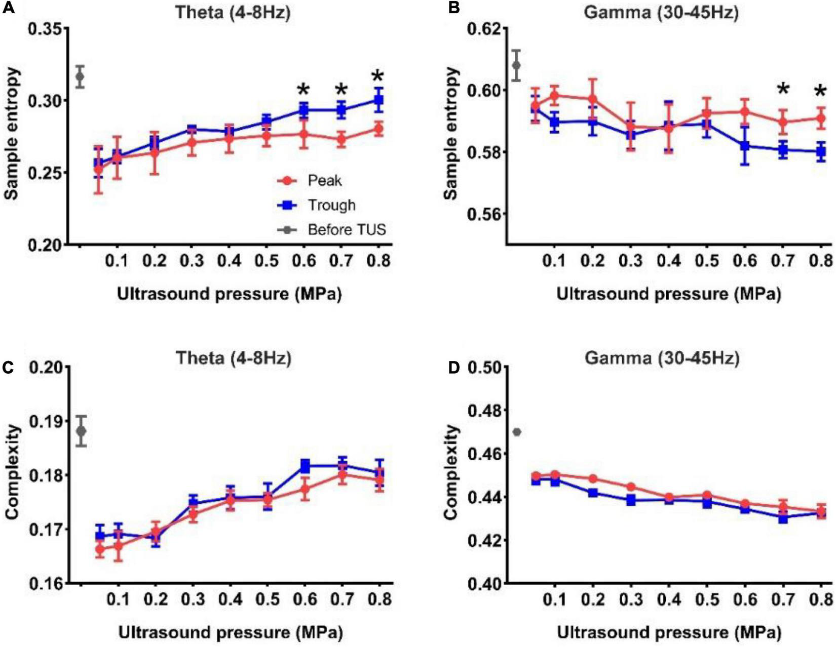 (A,B) The sample entropy of the theta and gamma rhythms before and after TUS under peak and trough stimulations with different ultrasound pressures, (A) theta rhythm, (B) gamma rhythm. (C,D) The complexity of the theta and gamma rhythms before and after TUS under peak and trough stimulations with different ultrasound pressures, (C) theta rhythm, (D) gamma rhythm. (mean ± SEM, n = 8 for peak stimulation, n = 8 for trough stimulation, *p < 0.05; Kruskal–Wallis test).