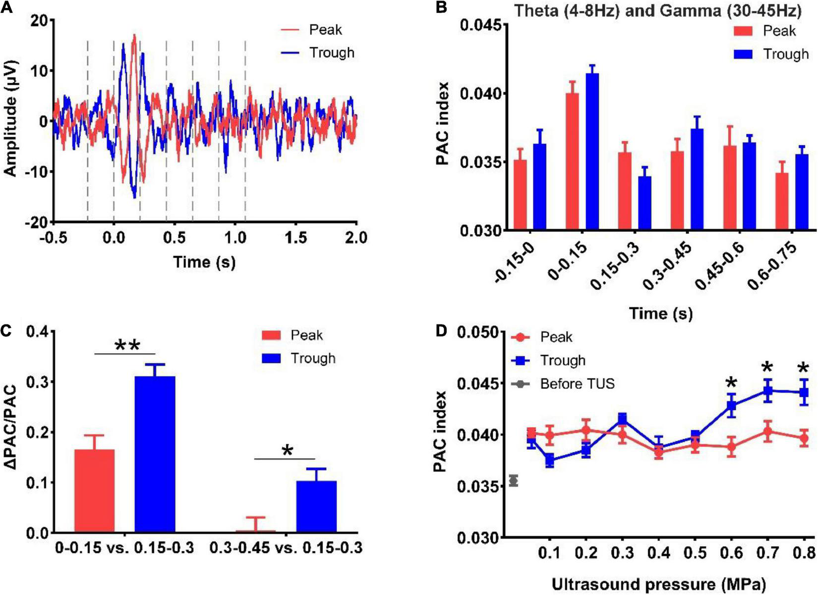 Finally, we analyzed the PAC strength of the theta and gamma rhythms evoked by peak and trough stimulation with different ultrasound pressures. First, we divided the LFP signals into six segments, viz. −0.15 to 0 s, 0–0.15 s, 0.15–0.3 s, 0.3–0.45 s, 0.45–0.6 s, and 0.6–0.75 s under peak and trough stimulation (Figure 5A). Thereafter, the PAC strengths of the theta and gamma rhythms at different time points were calculated, as shown in Figure 5B. We found that the PAC strength at 0–0.15 s (after TUS) showed a rising trend compared to −0.15 to 0 s (before TUS) under peak and trough stimulation, albeit without statistical significance. The coupling strength increased at 0–0.15 s, decreased at 0.15–0.3 s, and increased again at 0.3–0.45 s. In order to verify whether the value of the coupling strength differed under peak and trough stimulation during these periods (0–0.15, 0.15–0.3, and 0.3–0.45 s), we calculated the relative values of coupling strength at 0–0.15, 0.3–0.45, and 0.15–0.3 s. As shown in Figure 5C, We observed that the relative values of coupling strength at 0–0.15 and 0.3–0.45 s under trough stimulation were higher than those under peak stimulation (*p < 0.05, **p < 0.01; Mann-Whitney test). We analyzed the change in the coupling strength relative to ultrasonic pressure under peak and trough stimulations (Figure 5D). The coupling strength under trough stimulation was higher than that under peak stimulation between 0.6 and 0.8 MPa (*p < 0.05, **p < 0.01; Kruskal–Wallis test). These results demonstrate that peak and trough stimulation affect the PAC strength between the theta and gamma rhythms as a function of ultrasound pressure.