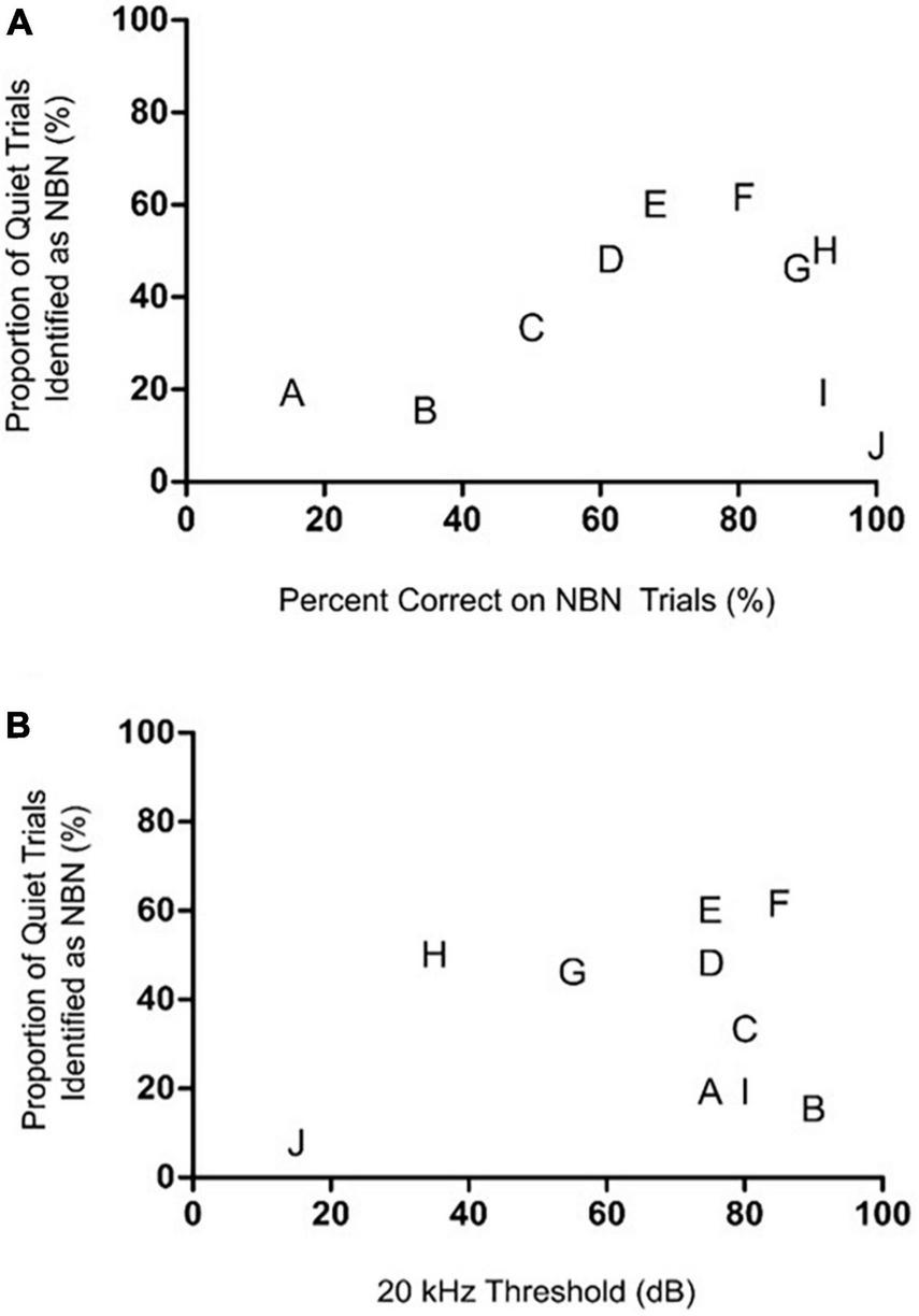 When each rat’s performance on NBN trials was plotted versus their quiet trial performance, no significant relationship was observed, indicating that an animal’s performance on NBN trials was not predictive of their performance on quiet trials (Figure 5A). This point is highlighted by the fact that rats which demonstrated the greatest decline in NBN performance post-sound exposure did not demonstrate the greatest increase in misidentified quiet trials (e.g., Rat A in Figures 4B, F, 5). Similarly, some of the rats that demonstrated the greatest increase in misidentified quiet trials post-sound exposure still scored > 80% correct on NBN trials (e.g., Rats H and G in Figures 4B, F, 5). This demonstrates that the changes in behavioral performance following the intense sound exposure were specific to the quiet condition, and were not related to a change in overall behavioral performance. As expected, rats exposed to intense sound (12 kHz tone, 120 dB SPL, 1 h) had a high-frequency hearing loss, characterized by an average post-sound exposure threshold of 66.5 ± 7.6 dB at 20 kHz, and by thresholds of 31.5 ± 2.6 dB and 40.5 ± 1.4 dB for the 4 kHz and click stimuli, respectively. Similar to the results depicted in Figure 5A, which plots each rat’s performance on NBN trials versus their performance on quiet trials, no clear relationship was observed between the level of high-frequency hearing loss for each rat and their performance on quiet trials post-sound exposure (Figure 5B). For example, Rats I and J both screened negative for tinnitus—as evidenced by no significant change in their quiet trial performance post-sound exposure (Figure 4E; filled red squares)—but these rats had dramatically different high frequency hearing thresholds resulting from the same sound exposure (Figure 5B).