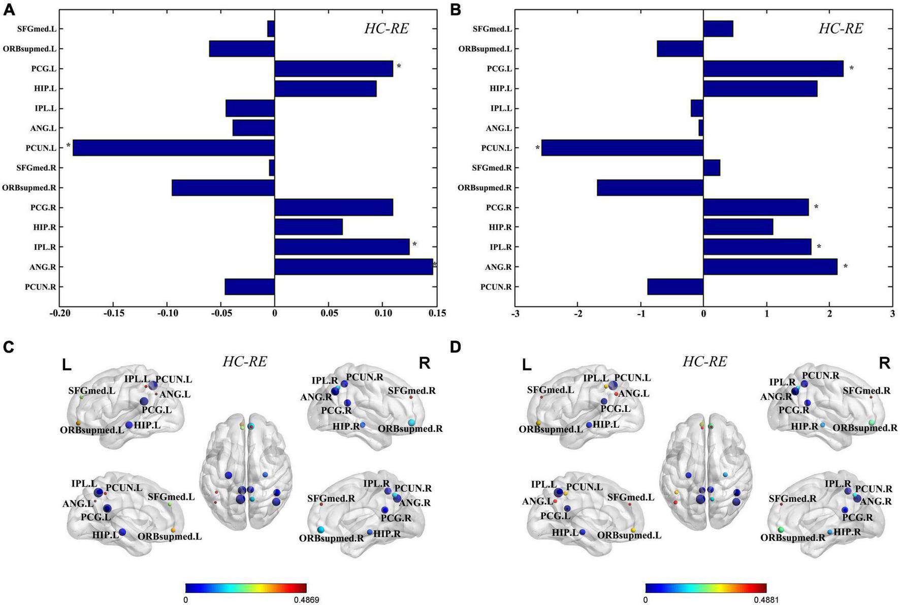 Regional graph theoretic measures. Differences of nodal efficiency (A) and degree centrality (B) for each node were evaluated between the TLE and HC group. The differences of nodes in nodal efficiency (C) and degree centrality (D) between the TLE and HC groups were displayed in the MNI space. The size of nodes represents difference between the TLE and HC groups, and the color of nodes and the color bar represent statistical significance. *Statistically significant (q < 0.05, FDR corrected). SFGmed, superior frontal gyrus, medial; ORBsupmed, superior frontal gyrus, medial orbital; PCG, posterior cingulate gyrus; HIP, inferior parietal gyrus; IPL, inferior parietal gyrus; ANG, angular gyrus; PCUN, precuneus; L, left; R, right.
