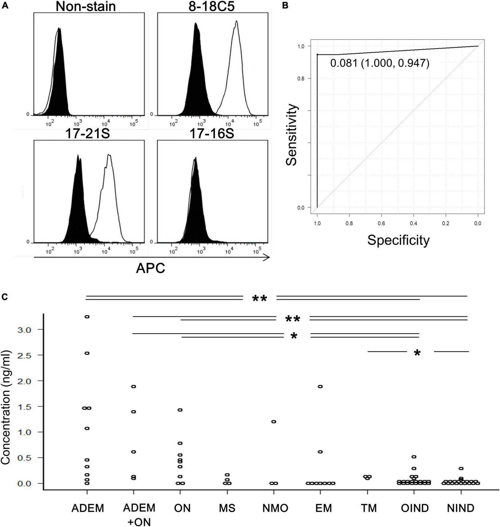 Titration of anti-MOG antibody by flow cytometry. (A) Representative histograms of cells stained with only the second antibody (non-stain), 8–18C5, or patients’ sera (17–21S; anti-MOG positive, 17–16S; anti-MOG negative). The APC intensity of empty cells (closed) and MOG-GFP cells (open) are shown. (B) An ROC curve from 35 samples for evaluation of the screening efficacy and for identification of a cutoff point of serum anti-MOG titer level. (C) Anti-MOG antibody titer ratios in various diseases (ADEM; 10, ADEM + ON; 5, ON; 9, MS; 4, NMO; 3, EM; 9, TM; 3, OIND; 21, and NIND; 20). Statistical analysis was performed using Kruskal–Wallis test and Steel–Dwass test (*P < 0.05, **P < 0.1).