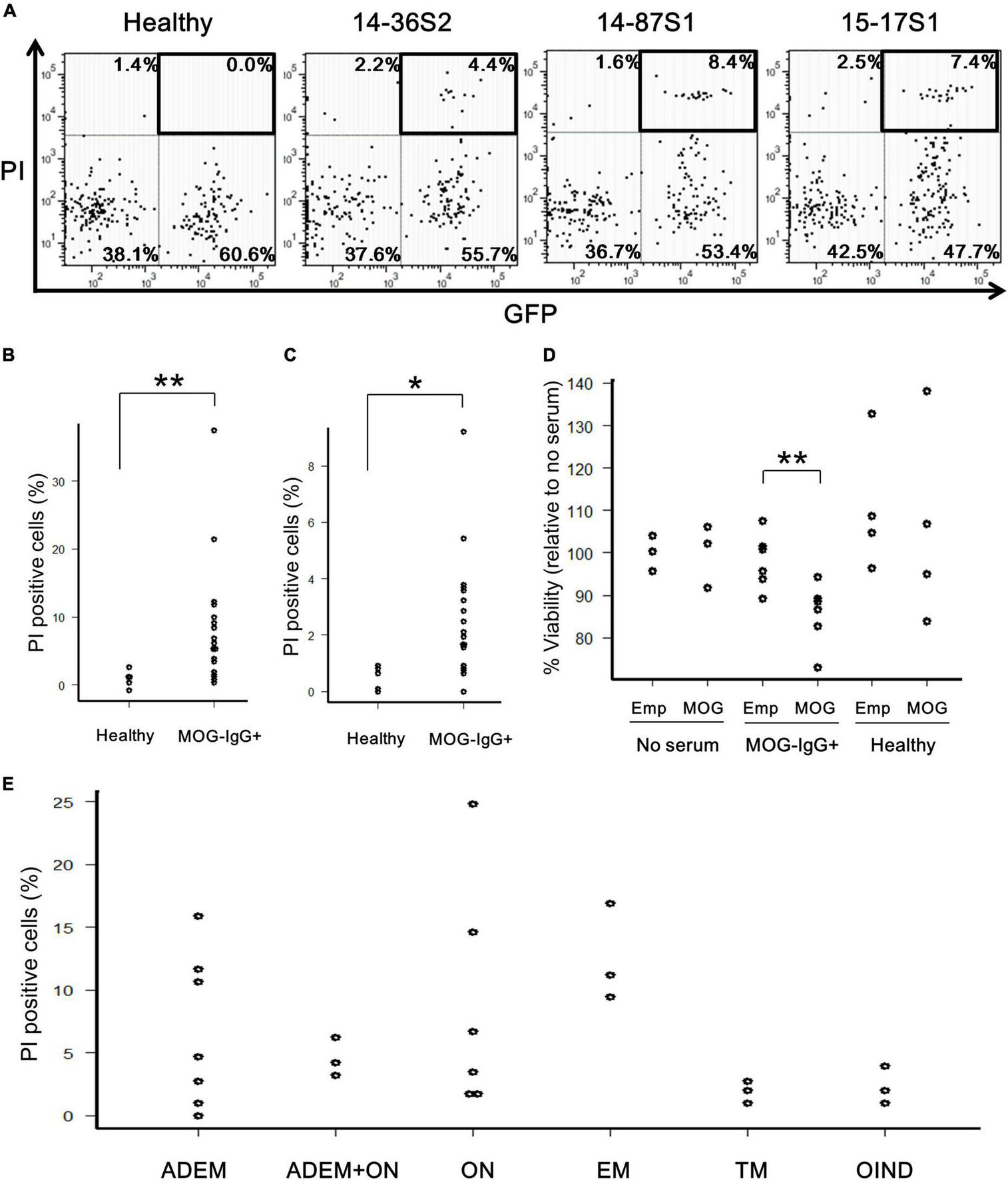 Cytotoxic effects of anti-MOG antibody in MOG-expressing cells. (A) Representative FACS plots of the cytotoxicity assay. The upper-right GFP+PI+ populations (boxed) in the dot plots show damaged MOG-GFP cells. Each proportion of PI-positive cells is calculated as: [number of GFP+PI+ (or GFP–PI+) cells]/[total number of MOG-GFP (or empty) cells]. Cell number in viable gate was considerably reduced because lots of cells died by complement assay. (B,C) Proportion of PI-positive cells among total GFP+ cells in the healthy (n = 6) or anti-MOG-positive (n = 18) groups. Panel (B) shows a result with rabbit complement and panel (C) shows one with human complement. Statistical significance was determined by Mann–Whitney U test (*P < 0.05, **P < 0.01). (D) Cell viability of empty (Emp) and MOG-GFP cells (MOG) treated with/without sera measured by the MTS assay. The sample size was no serum (n = 3), anti-MOG positive serum (n = 6), and healthy serum (n = 4). Mann–Whitney U test was used for statistical comparison between Emp and MOG (**P < 0.01). (E) Main data tested for PI-positive cells are plotted by disease group (n ≥ 3 in each group): 27 patients with confirmed MOG antibody positivity, including ADEM (n = 7), ADEM + ON (n = 3), ON (n = 6), EM (n = 3), TM (n = 3), and OIND (n = 3). Statistical analysis was performed using Kruskal–Wallis test and Steel–Dwass test, and no differences were detected.