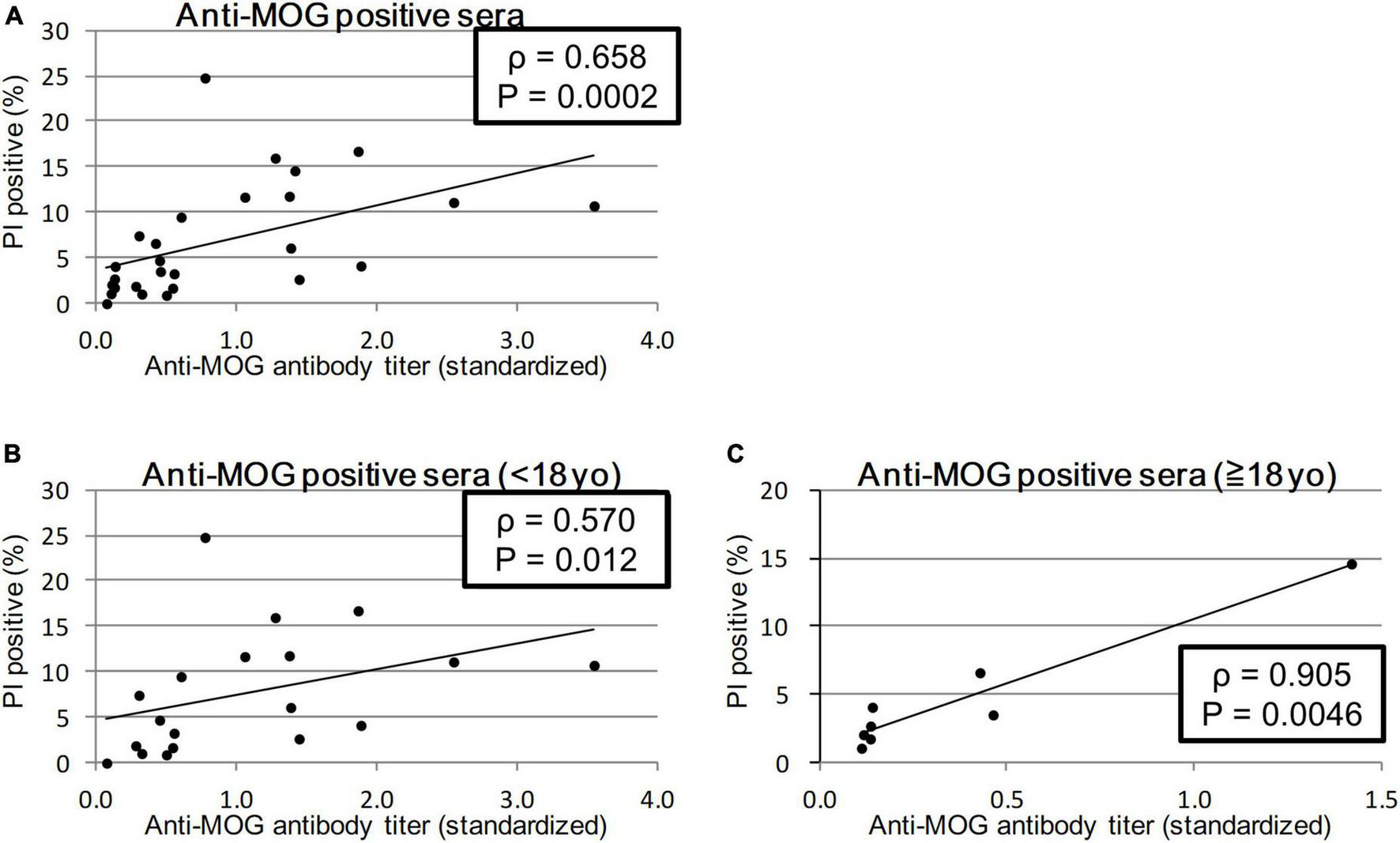 We calculated the Spearman’s rank correlation coefficient between the anti-MOG antibody titer and MOG-GFP cell cytotoxicity indicated by PI staining. Sera from all patients showed a significant moderate correlation between antibody titer and cytotoxicity (ρ = 0.658, P = 0.0003; Figure 3A). When sera from the child group (<18 years) and the adult group (≥18 years) were analyzed separately, while the former had a moderate correlation (ρ = 0.570, P = 0.012), the latter had a close correlation (ρ = 0.905, P = 0.0046) (Figures 3B, C).