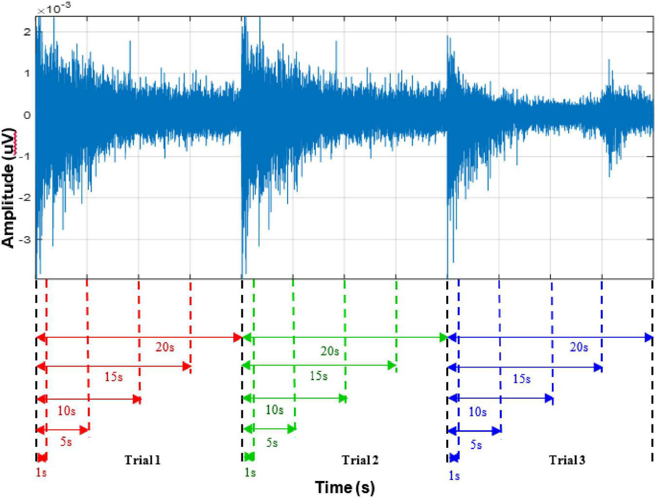 Conceptualized diagram of varying signal recording lengths considered in the study for three trials.