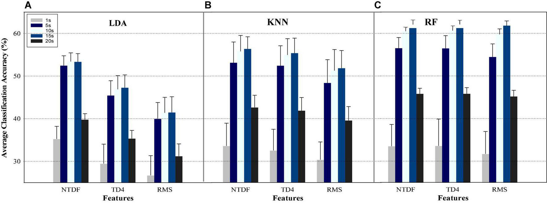 Utilizing different classifiers and feature sets, Figure 3 presents the average classification accuracies across the fifteen-finger motion tasks across eight subjects. The aim here is to examine the impact of individual SRD (1, 5, 10, 15, and 20 s) on the classification performance EMG-PR system. It can be observed from the result presented in Figure 3 that the average classification accuracy varies across the features and classifiers. For instance, 5 s SRD achieved the highest CAs across subjects and finger gestures with an increment ranging from 0.01 to 3.86% for the LDA classifier when compared with the performance of the other SRD groups. Similarly, some worth different phenomenon was observed when KNN and RF classifiers were employed. The 10 s (for RF) and 20 s (for KNN) outperformed other SRD groups with an increment in the classification accuracies ranging from 0.22 to 8.26% and 0.33 to 7.99%, though with an insignificant difference with the other SRD groups except for 1 s SRD. In terms of feature performance, the NTDF achieved the highest average accuracies while RMS has the lowest accuracies for all the classifiers.